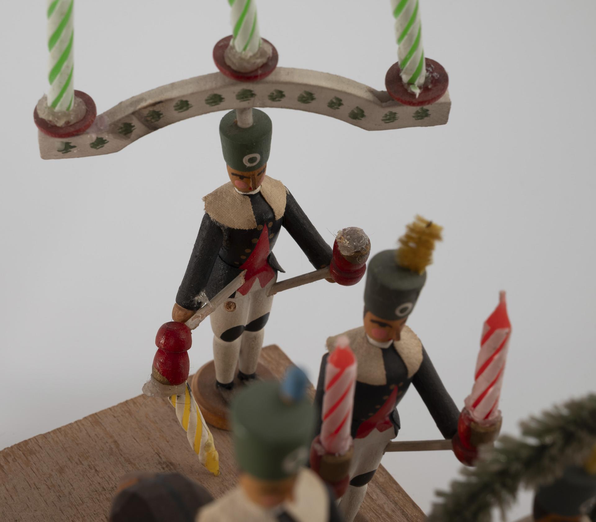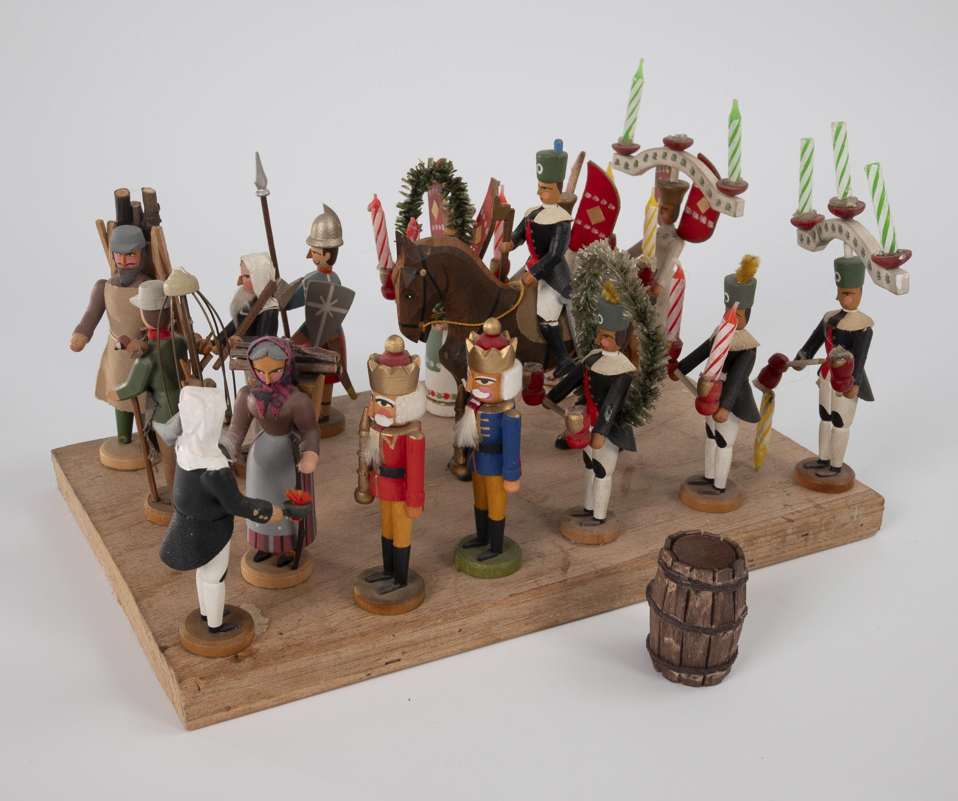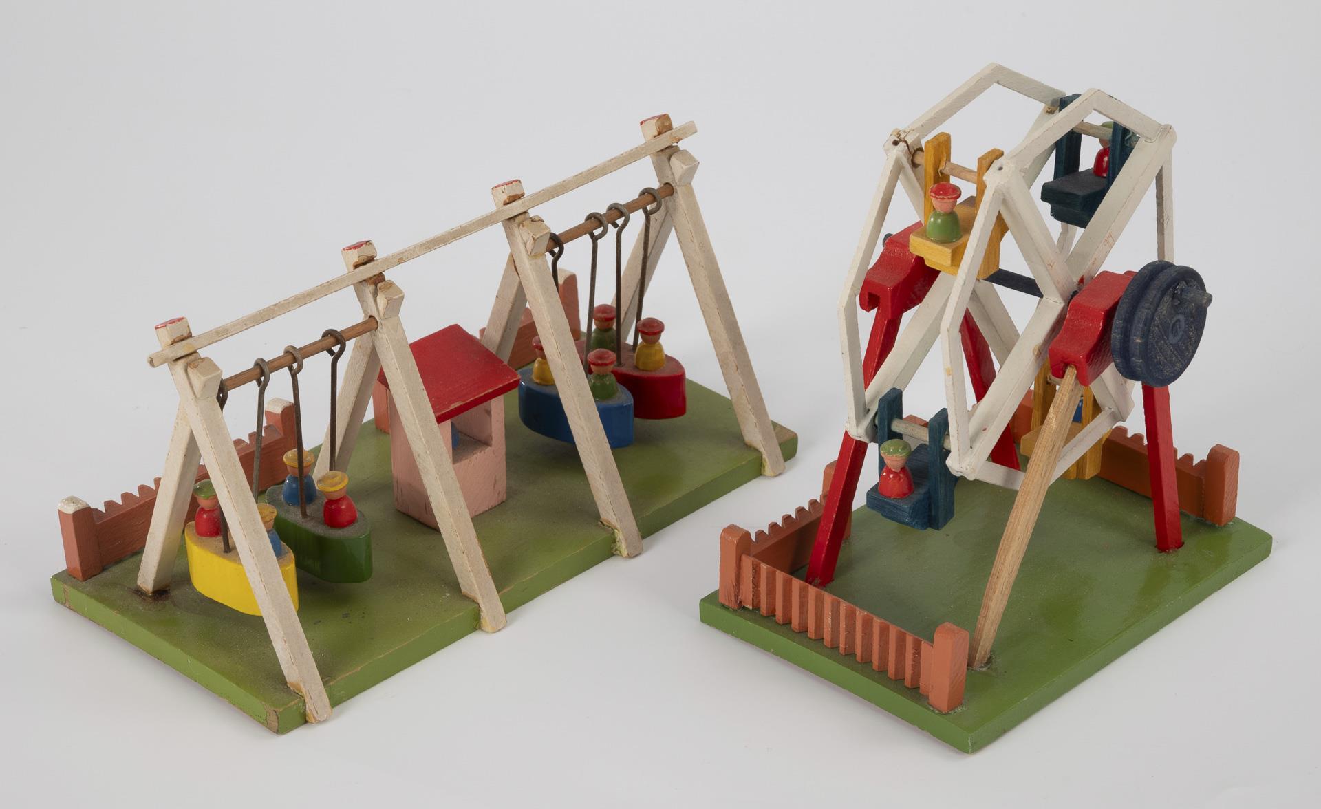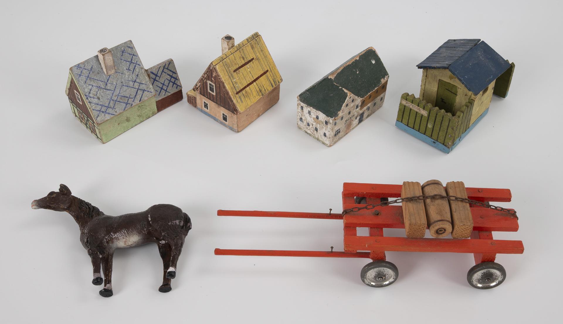 2x funfair: Ferris wheel and swing boat, each on a green base, h 9.5 - 13.5 cm. / 3 houses and 1 toilet house, H 5.5 - 7.5 cm. / Horse with cart, l 20 cm / Including wooden panel with various glued figures (candlestick angel, miners, nutcracker, peddler and soldier), 14 x 16 x 26 cm. Signs of age, minor defects.
