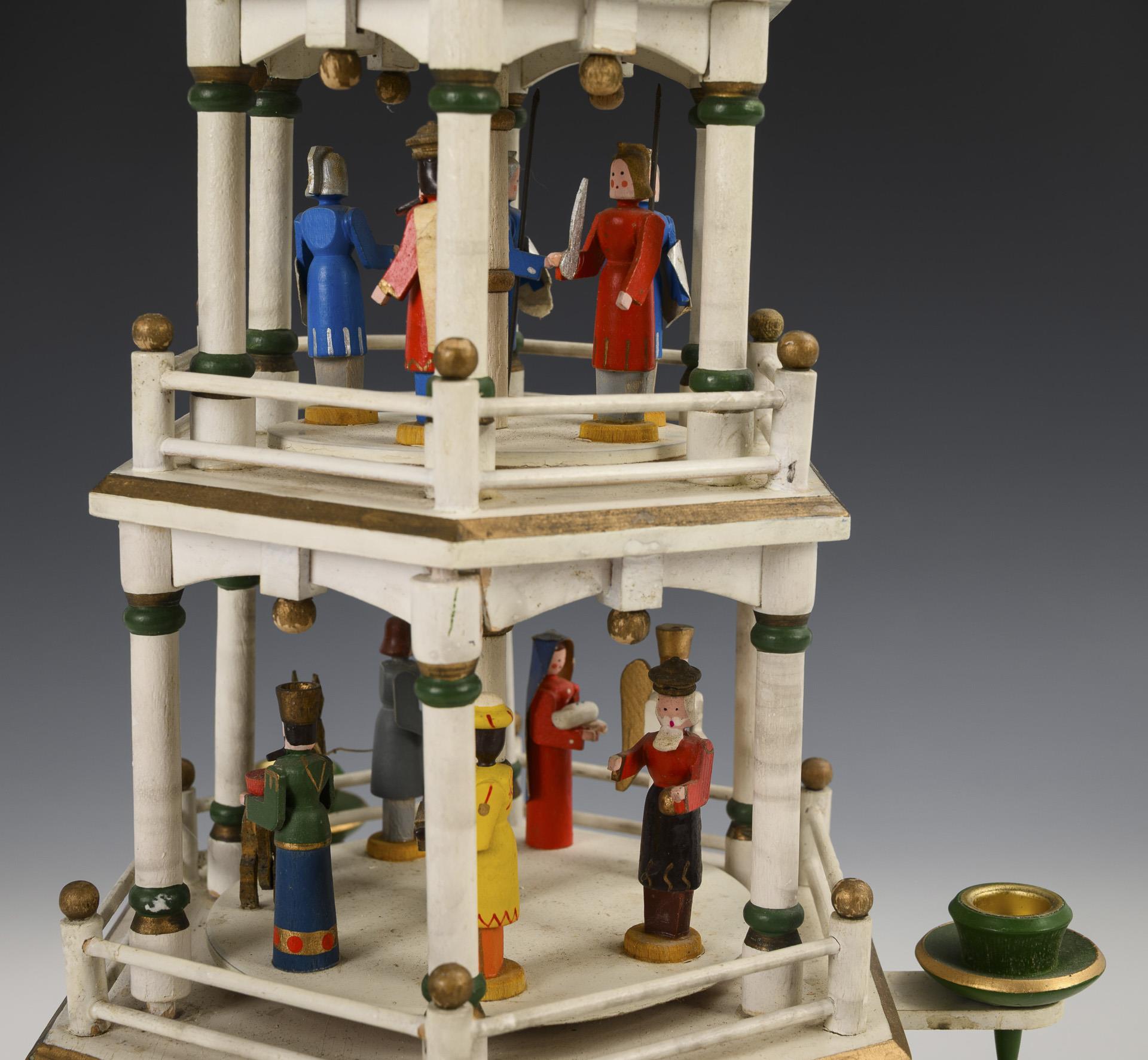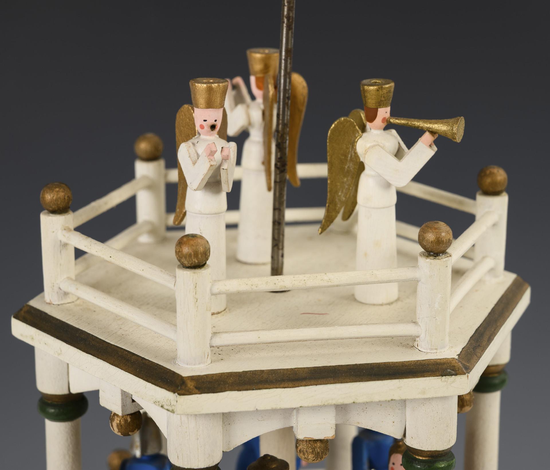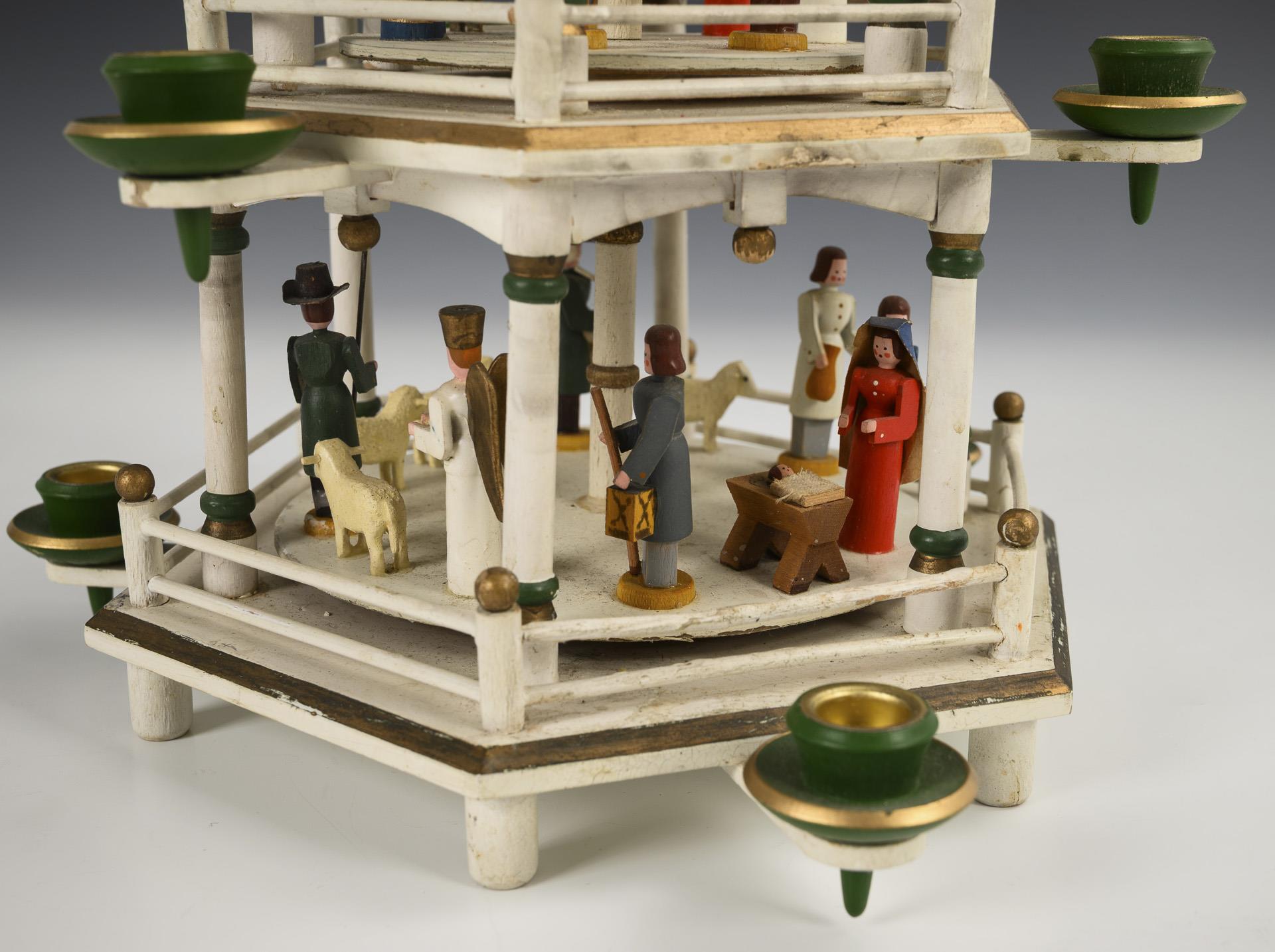 Hexagonal, white pyramid with 3 rotating levels (shepherds, Adoration of the Magi and soldiers), crowned by 3 angels playing music. Slight signs of age.