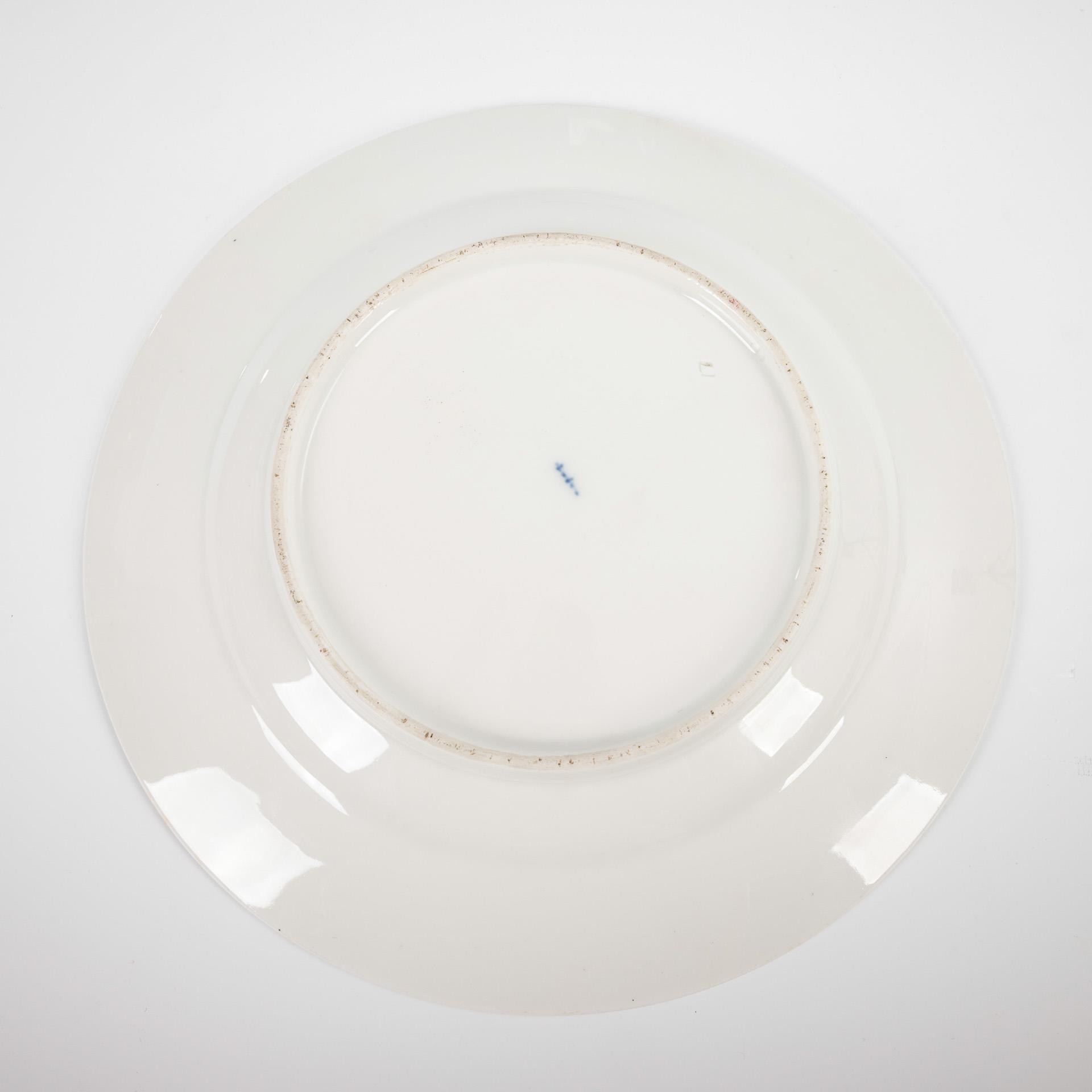 Smooth shape. On the rim a fine, gold-etched acanthus leaf band and vermiculé ground, in the mirror against a pink ground a gold rectangular cartouche with a medallion depicting a young lady with a pearl necklace. Partial minimal gold abrasion.