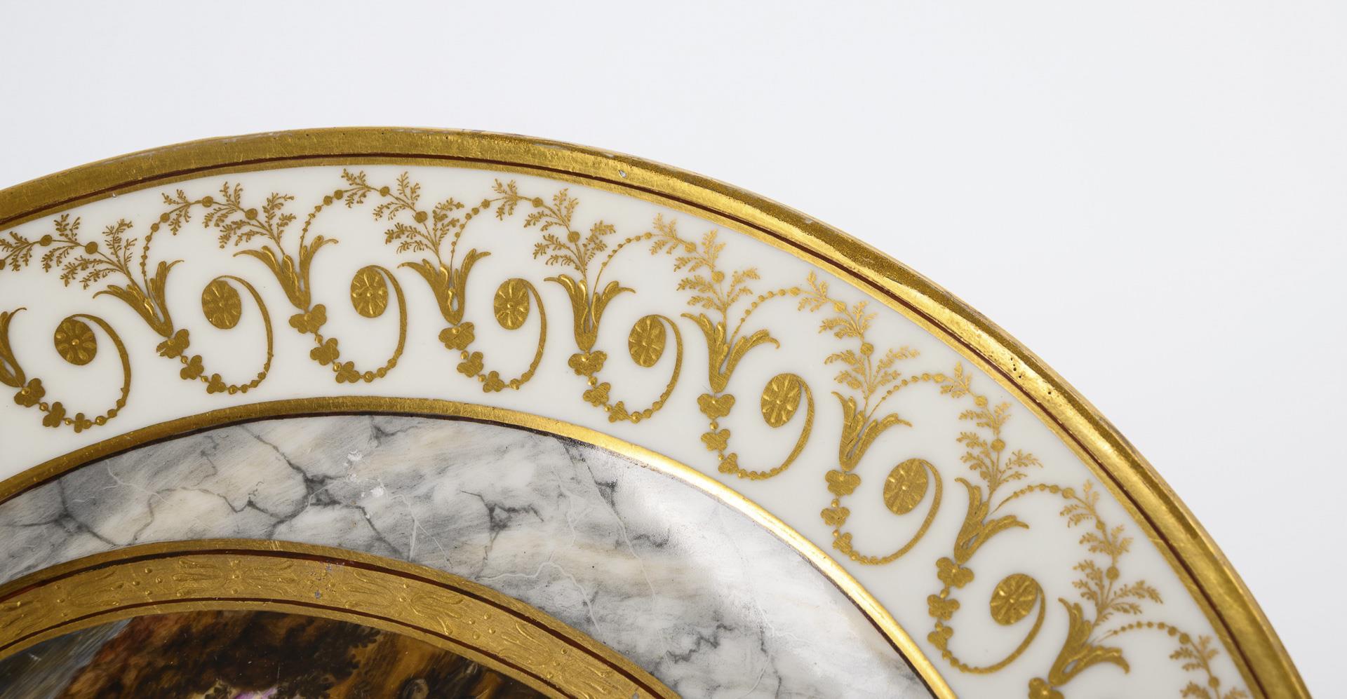 In the mirror an oval medallion framed in gold in relief against a gray, marble-optic background, in the medallion the depiction of the sleeping Antiope and the god Jupiter in the form of a satyr, verso inscribed "Jupiter et Antiope.". On the rim vegetal, partly reliefed gold painting. Gold retouched edge decoration.