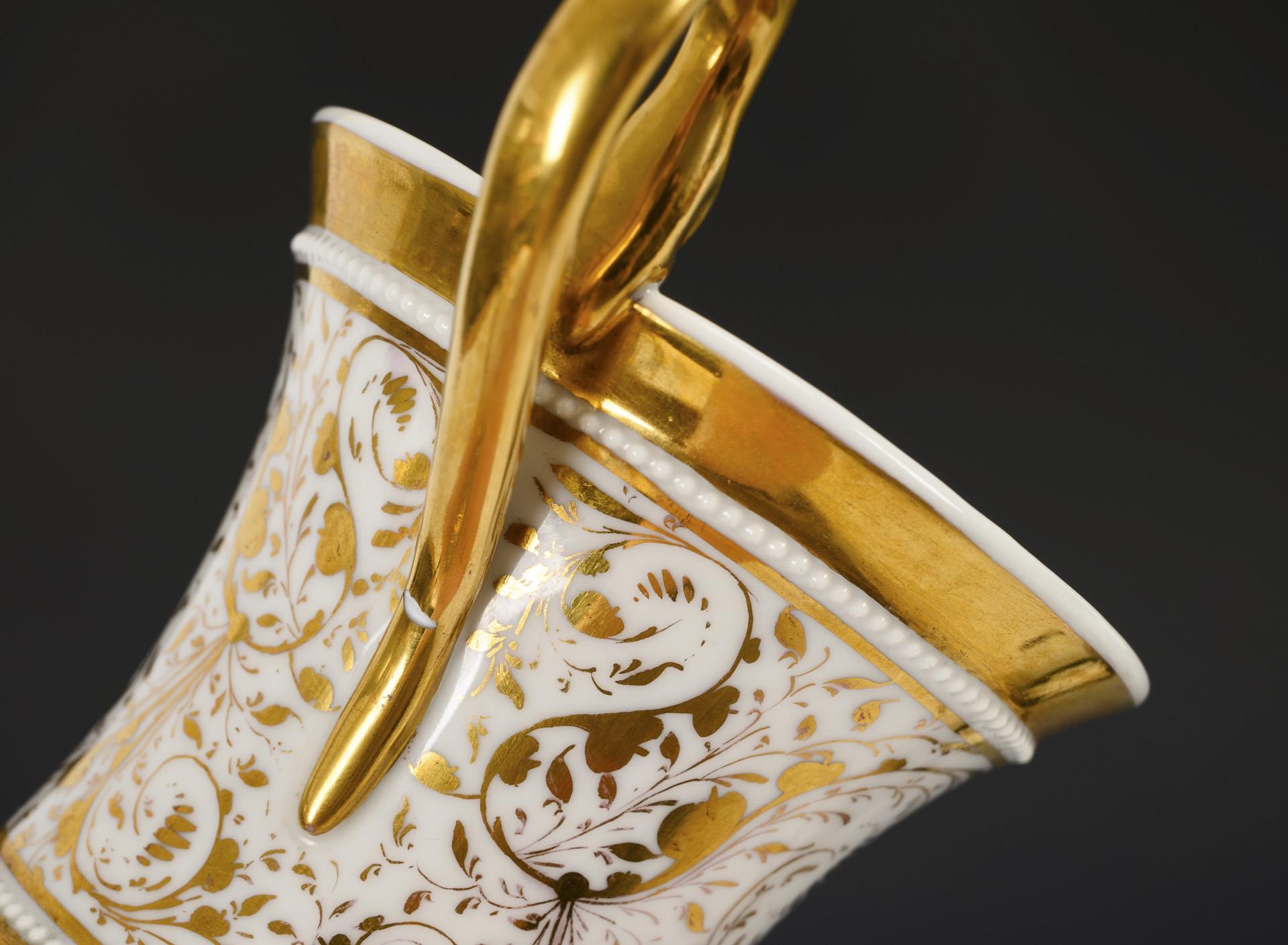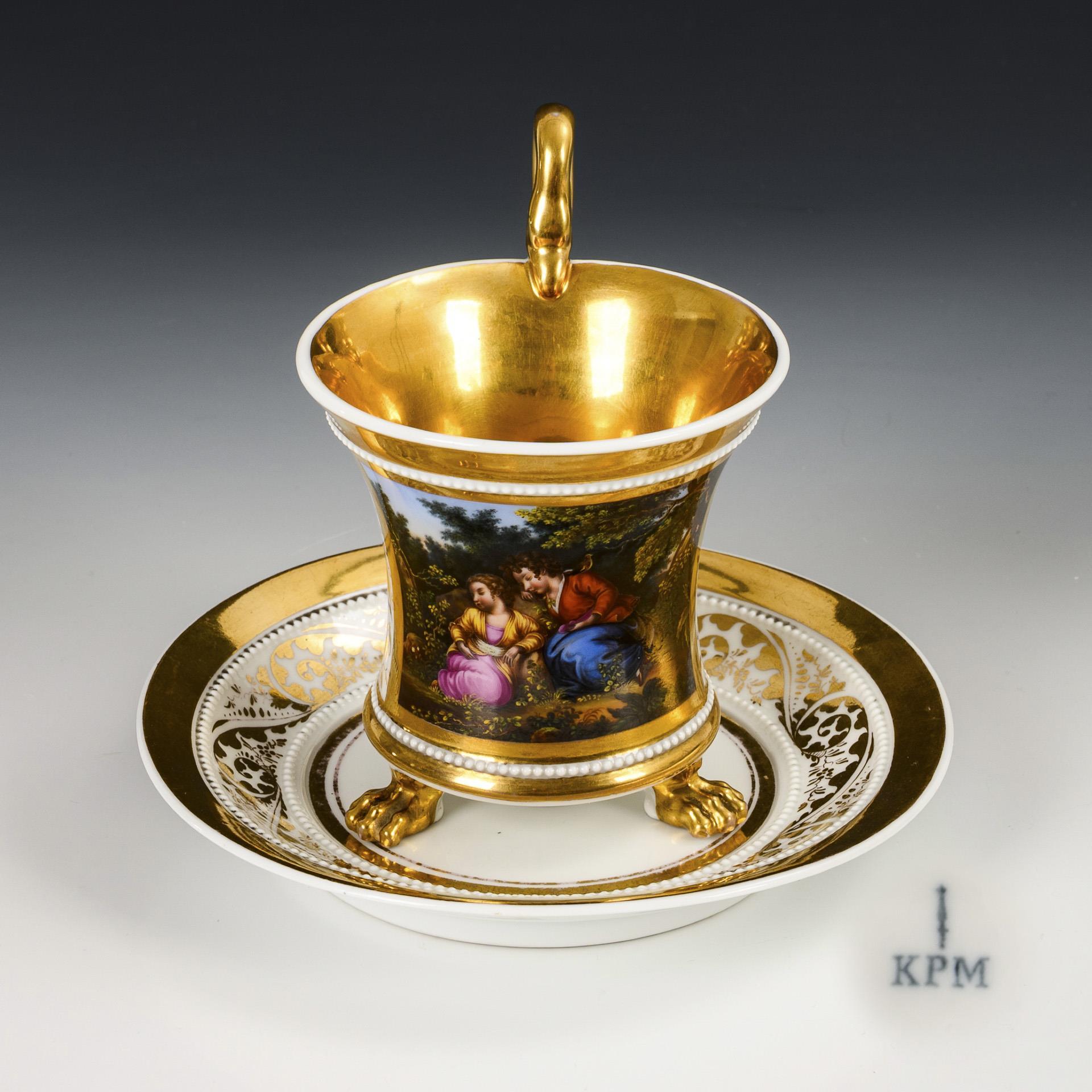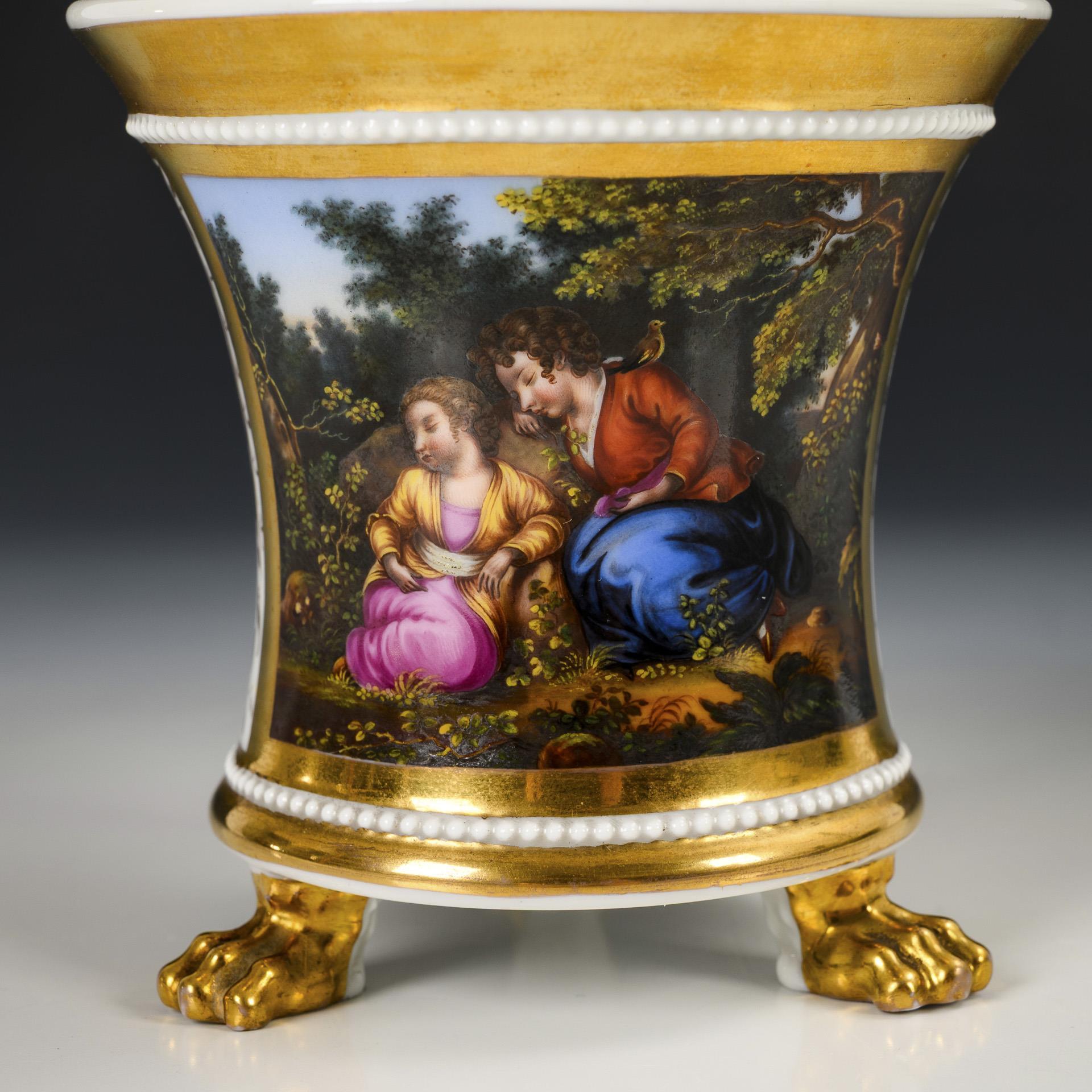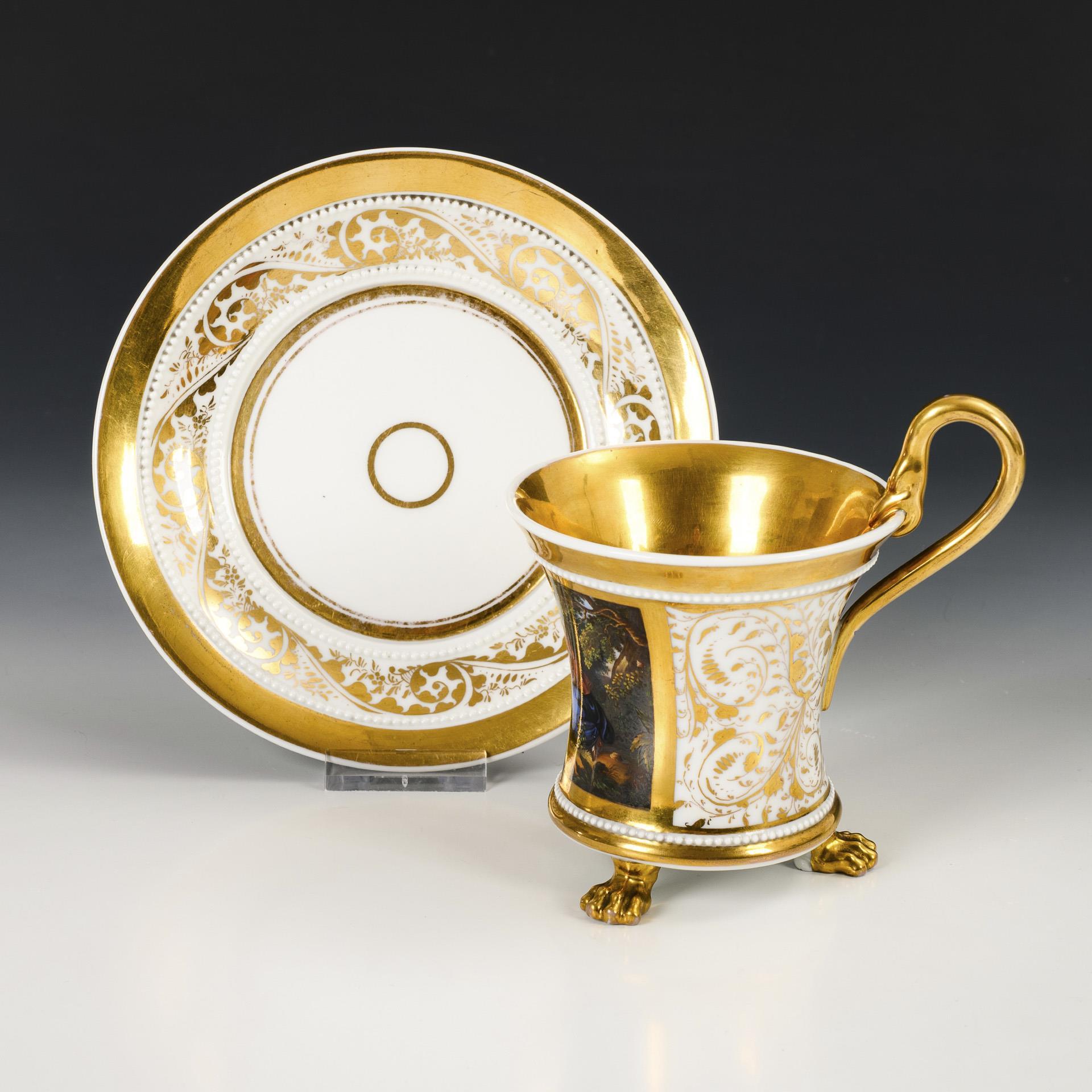 Cratered cup with pearl bands, swan handle and three paw feet. On the front a gold-framed rectangular cartouche with the depiction of a pair of children sleeping in the forest, verso vegetal gold painting, gilded inside. Hairline crack in the handle.