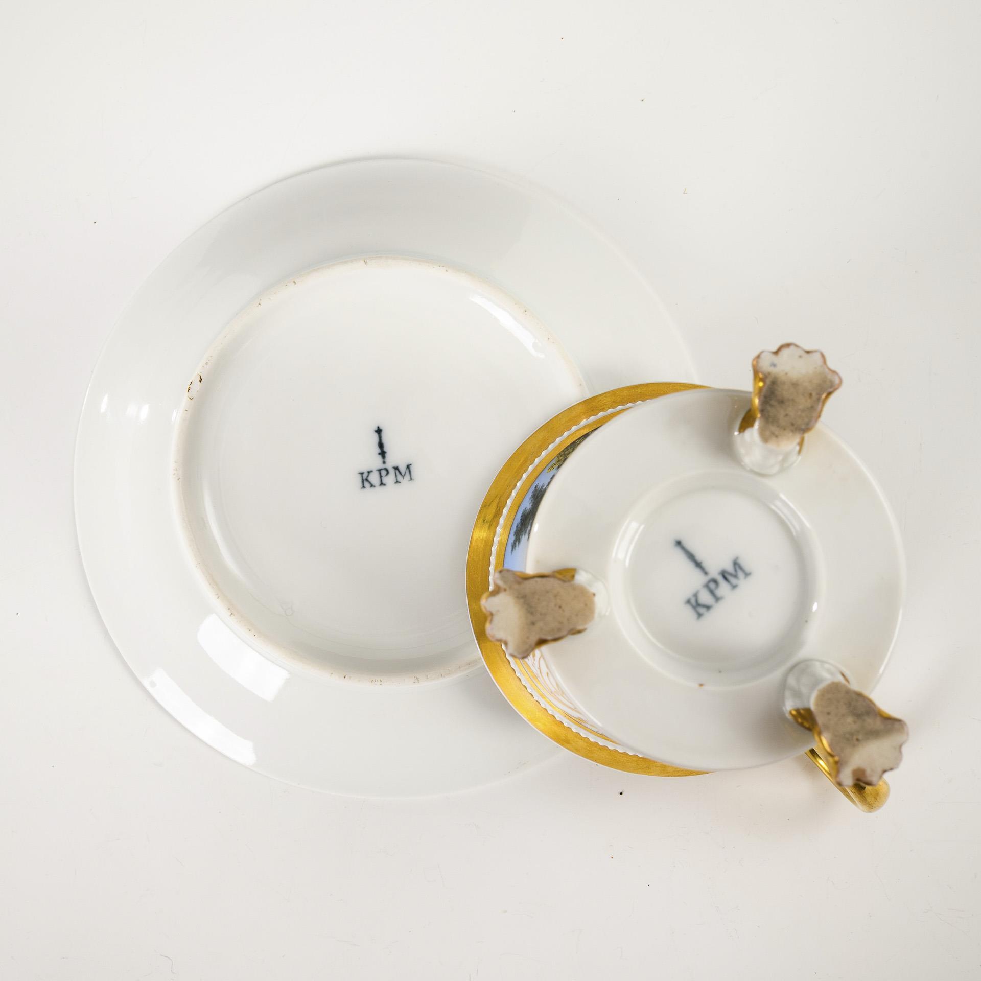 Polychrome painted, decorated in gold. Cup (h 12 cm), original saucer (Ø 16 cm).