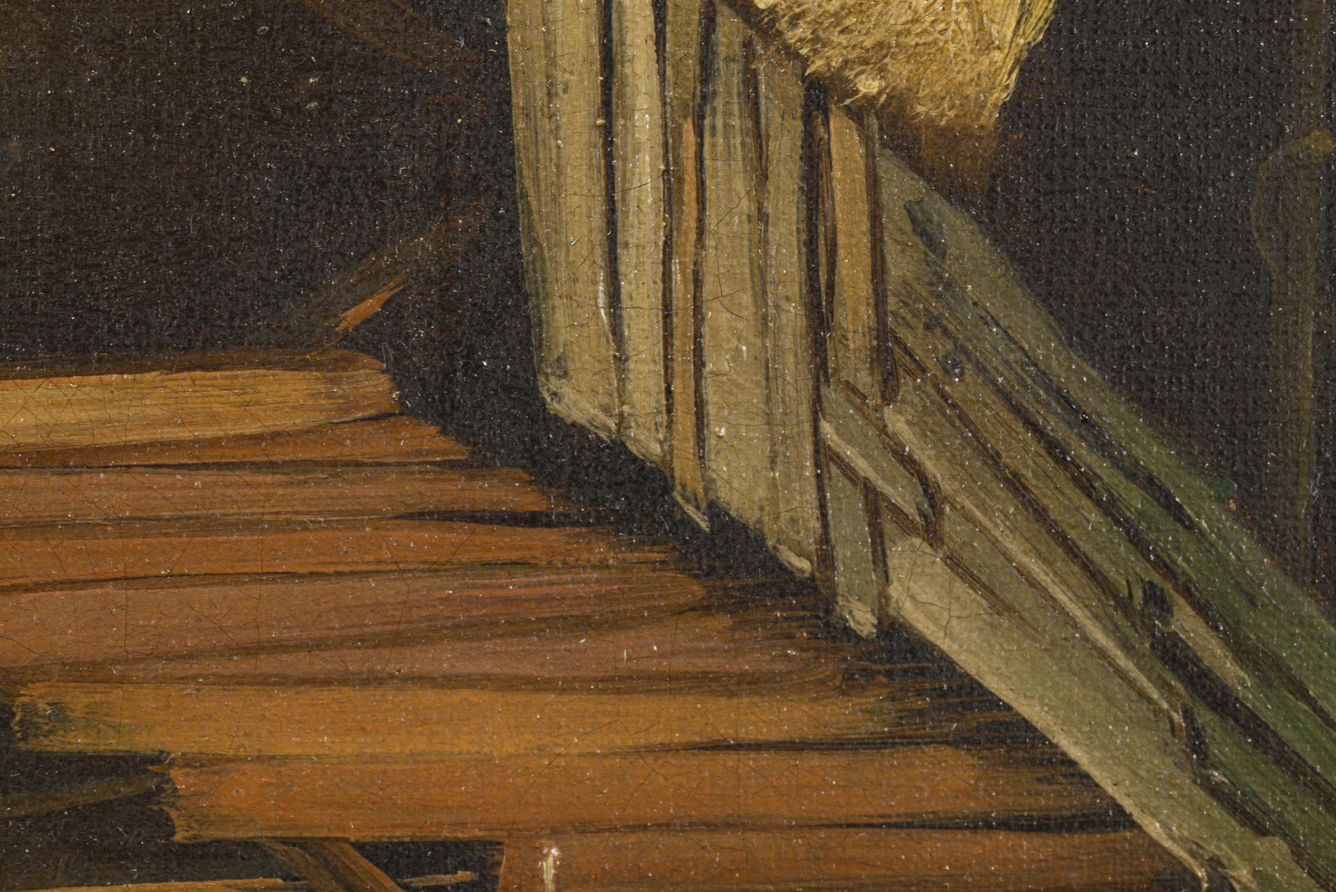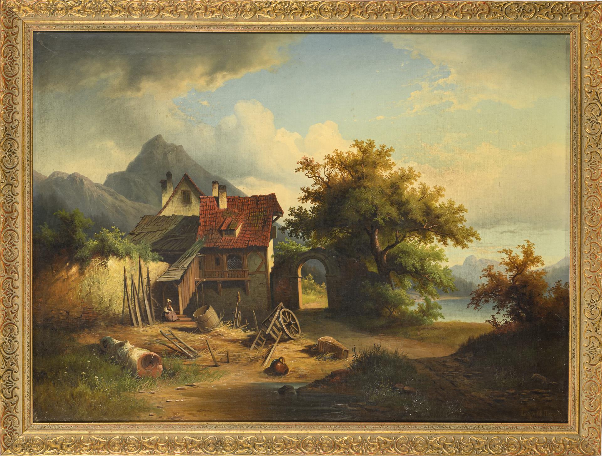 Staffage figure in front of the courtyard with a broken cart in the warm sunshine near the mountain lake. Minimal traces of age.