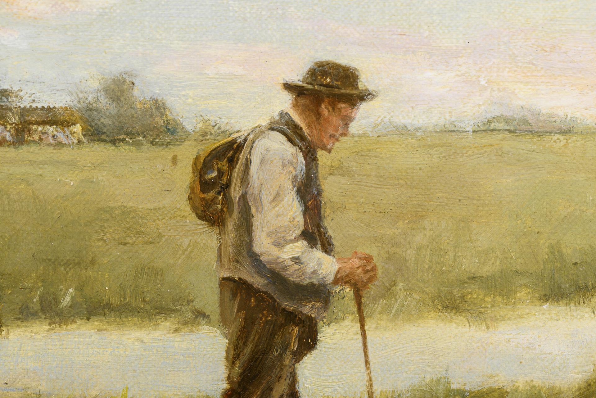 Hiker at a pond next to a pasture with cattle on a summer's day.