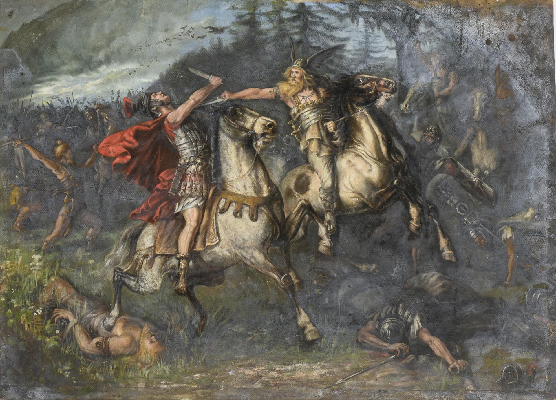 Probably Vercingetorix in the equestrian battle against the Romans at the dense edge of the forest. In need of cleaning.