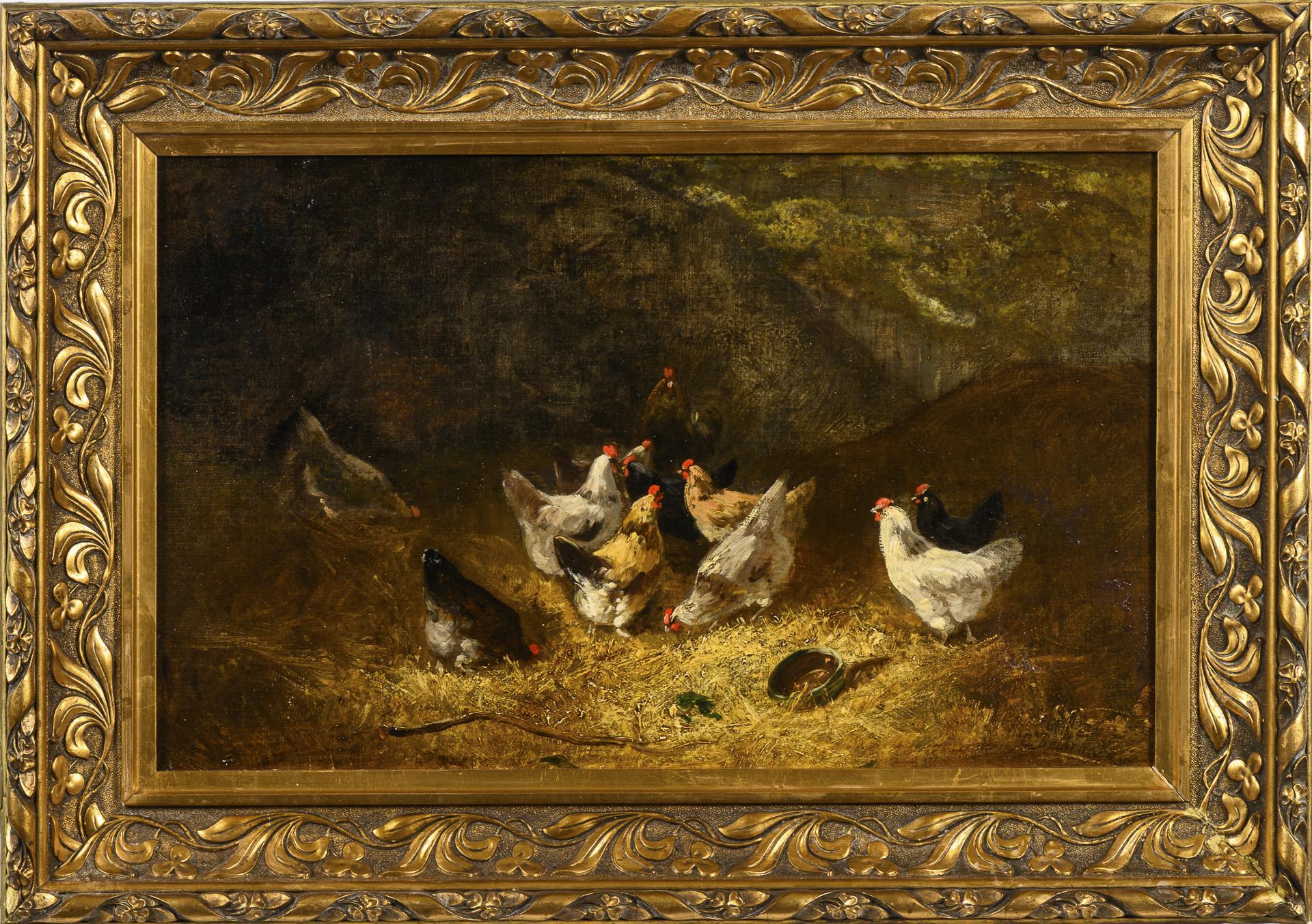 The animals on the straw searching for food against an indistinct background. Traces of age.
