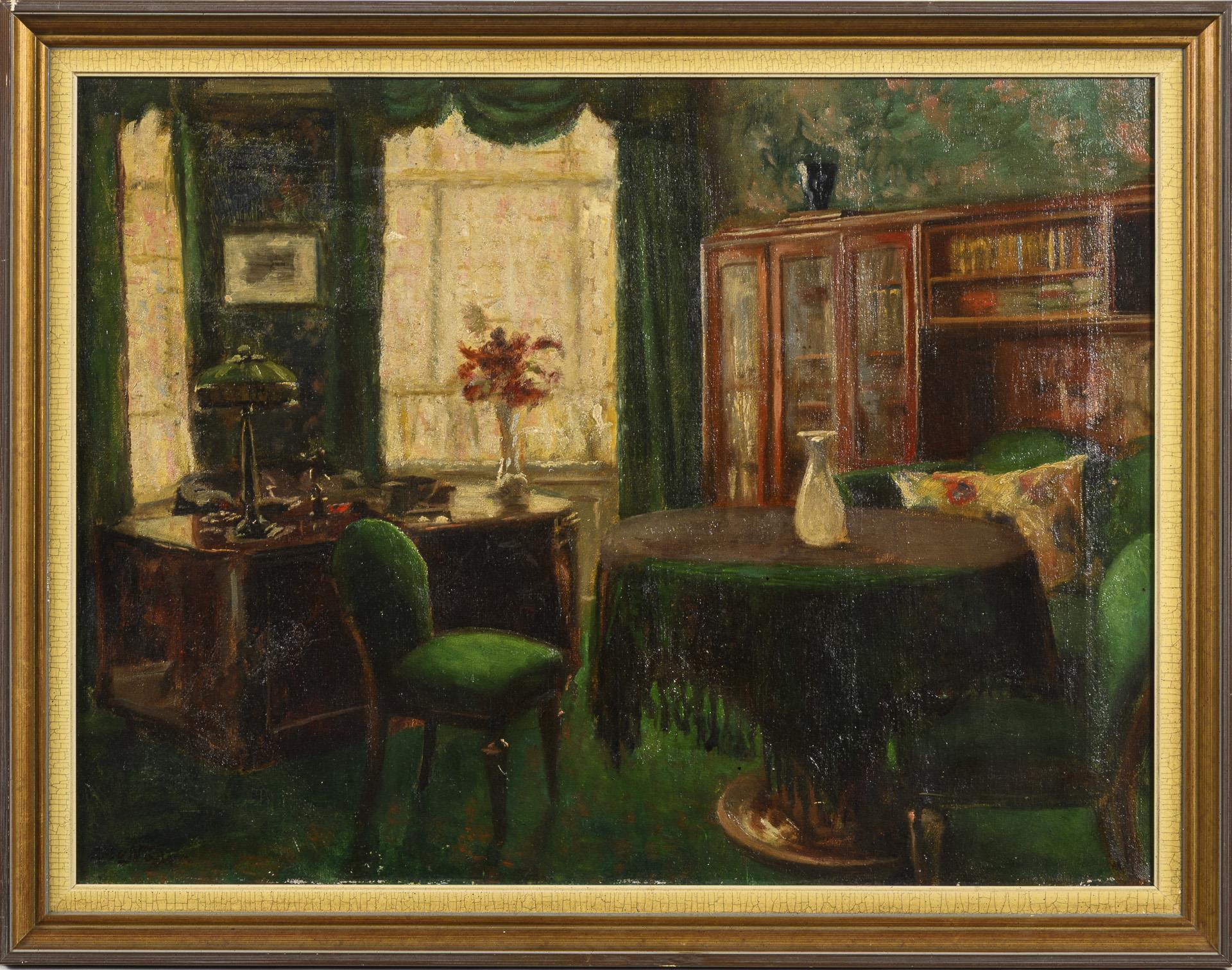 Bourgeois parlor with round table between the seating area and desk by the window. Slight traces of age.