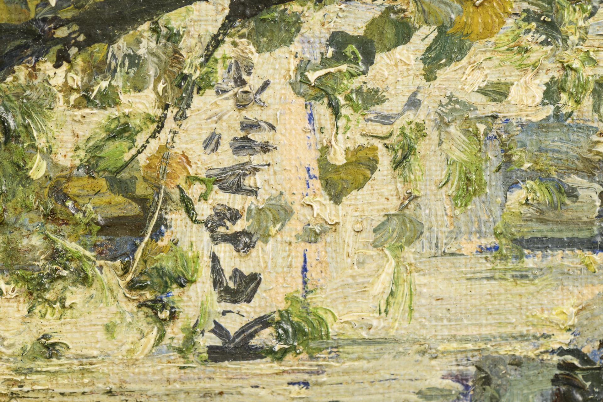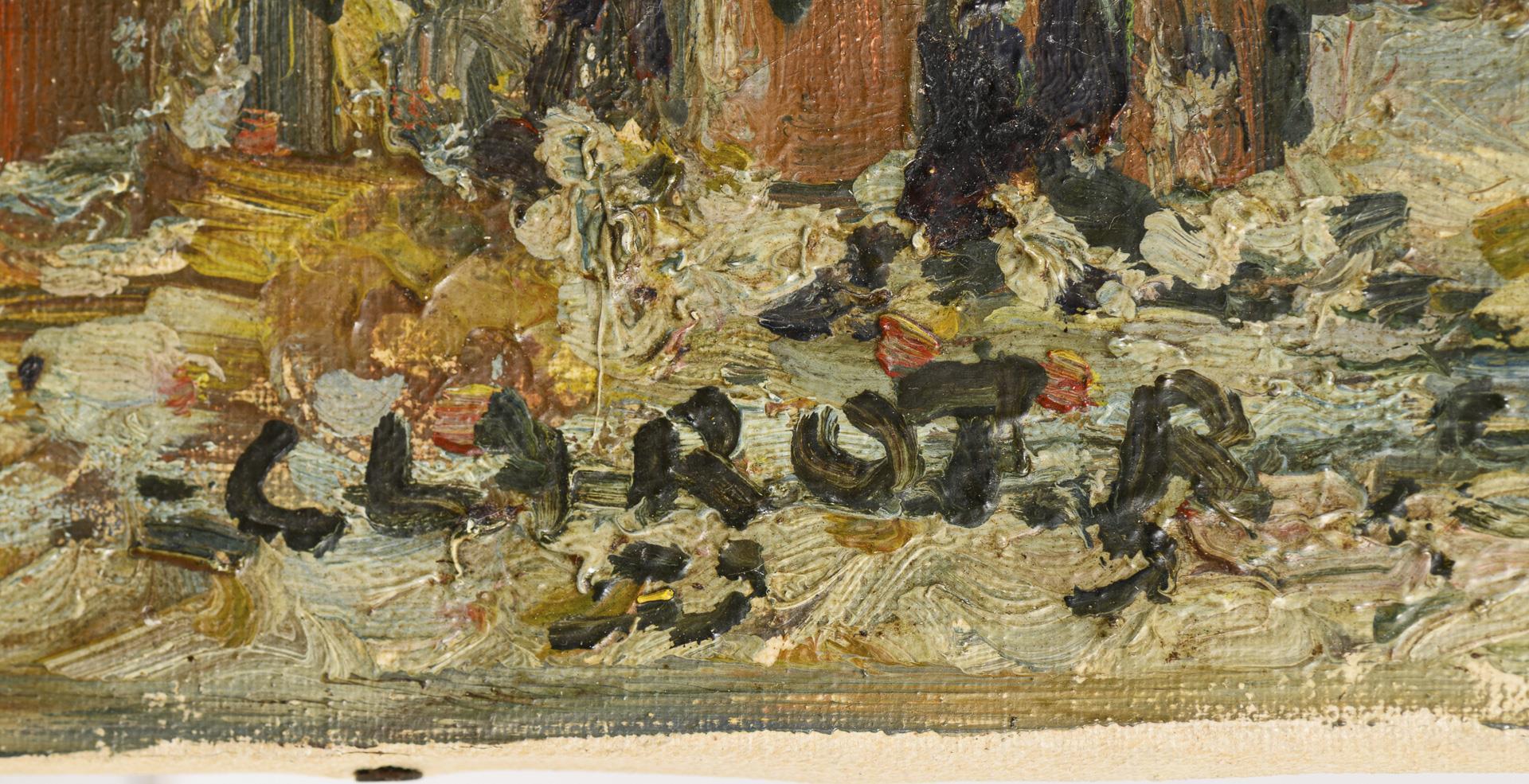 Lively activity on the market square under the trees at the well-frequented stalls. A small restored area with backing.