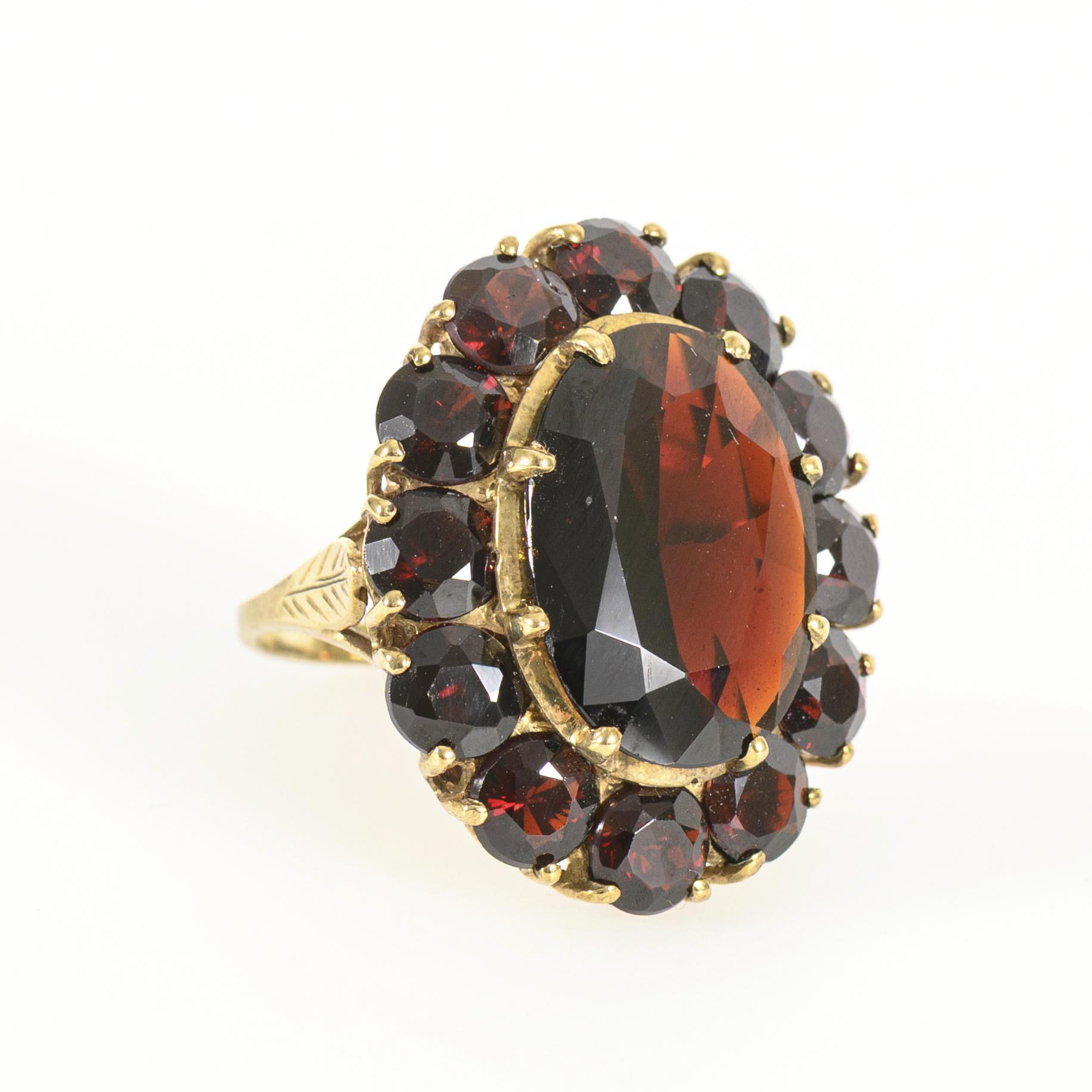 Ring with very large ring head with garnet setting, consisting of one large oval and 12 smaller round-faceted garnet stones in chaton setting. With traces of wear on the underside and earlier ring size extension.