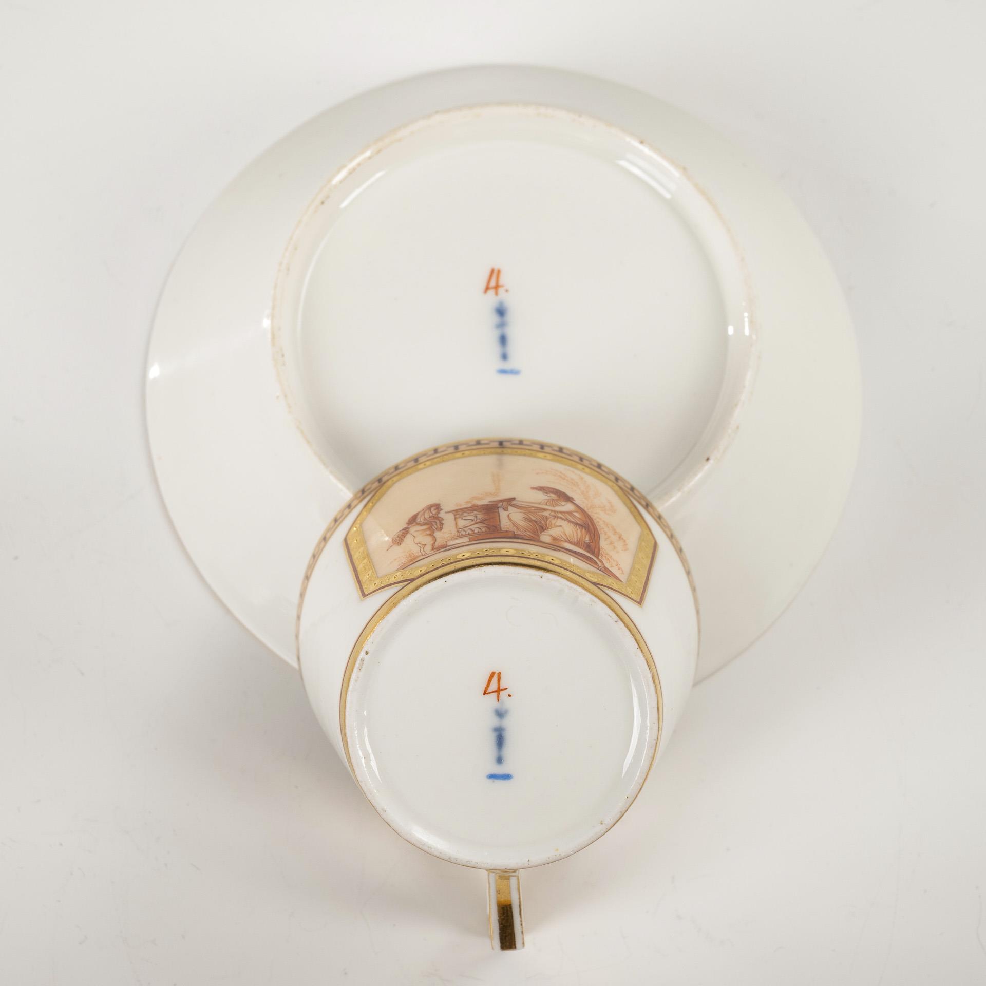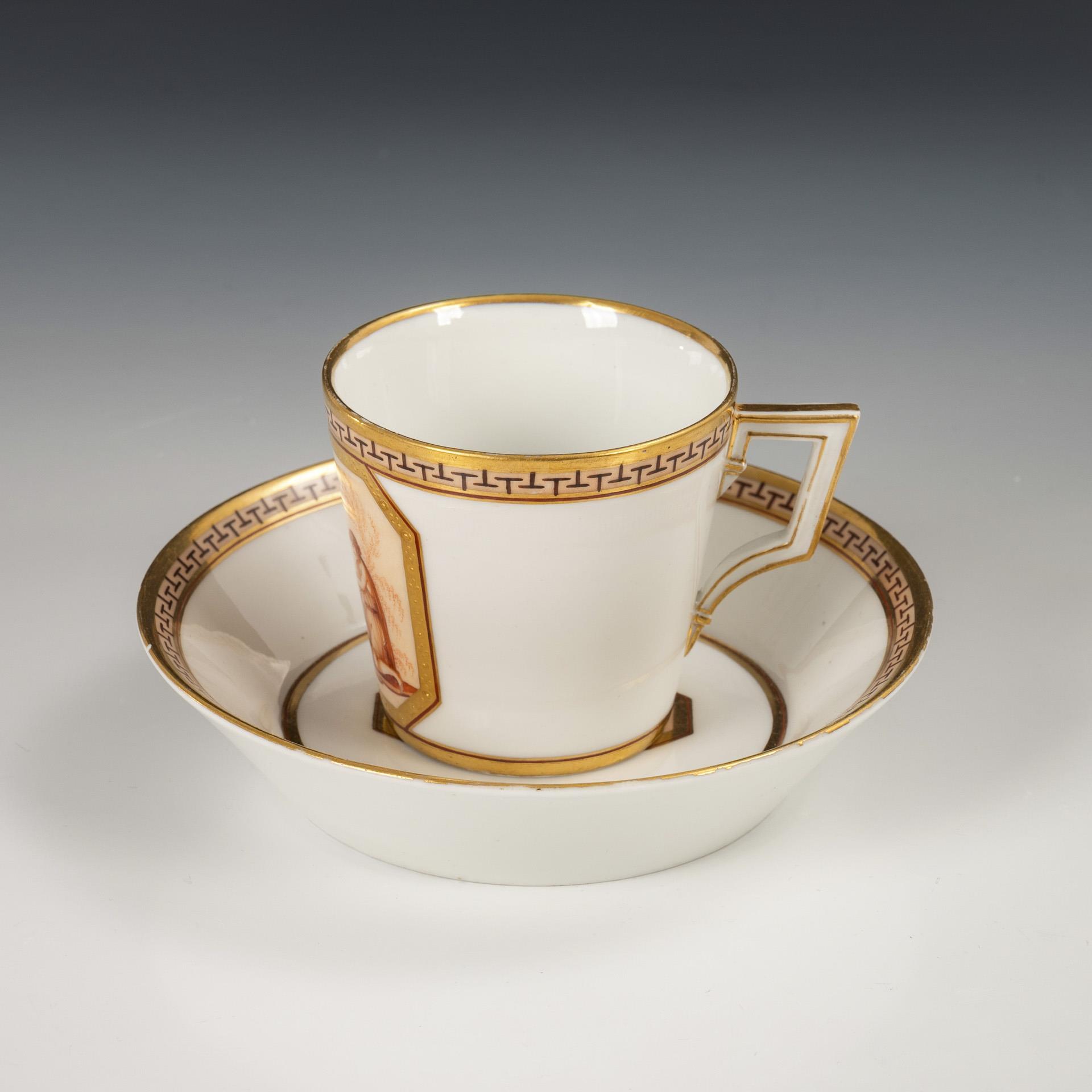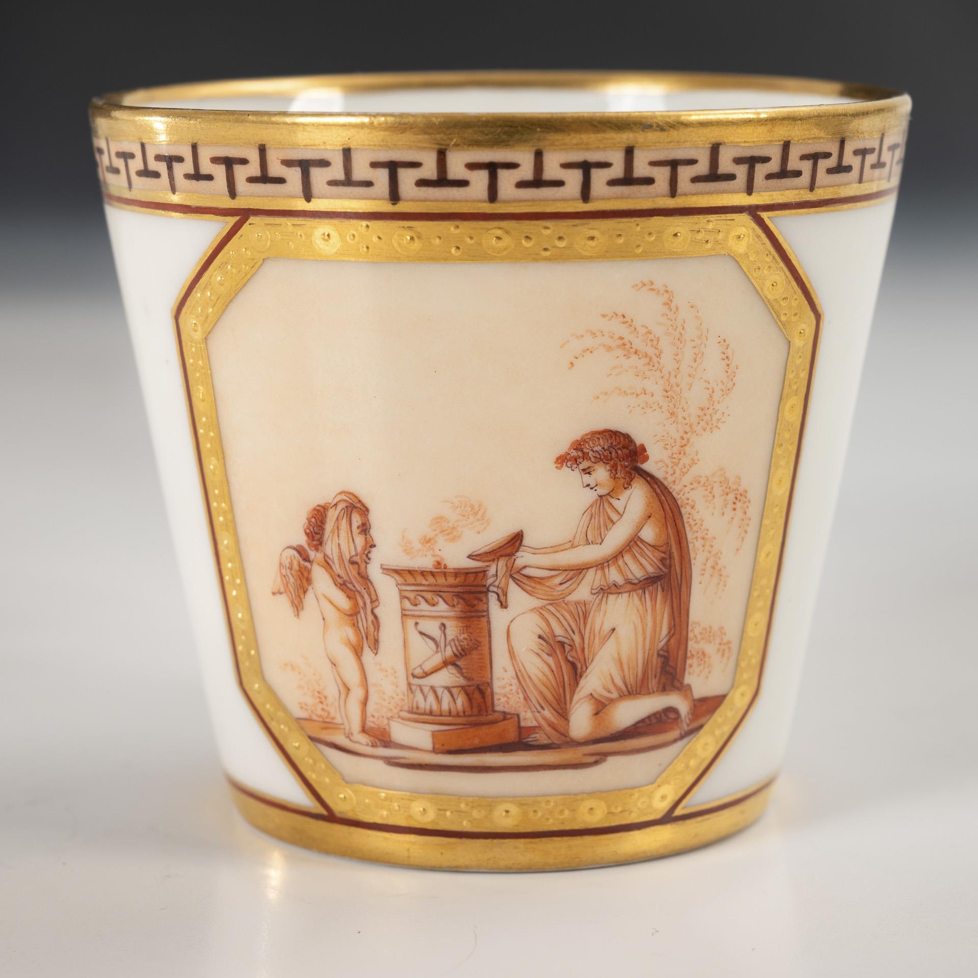 "Conical" model. Under a border a gold-framed rectangular cartouche with the depiction of an antique young woman painted in brown camaieu, offering a sacrifice at an altar, opposite her a cupid boy with a mask, in the mirror of the saucer the inscription "L'Amour et l'Amitié.". Handle minimally chipped.