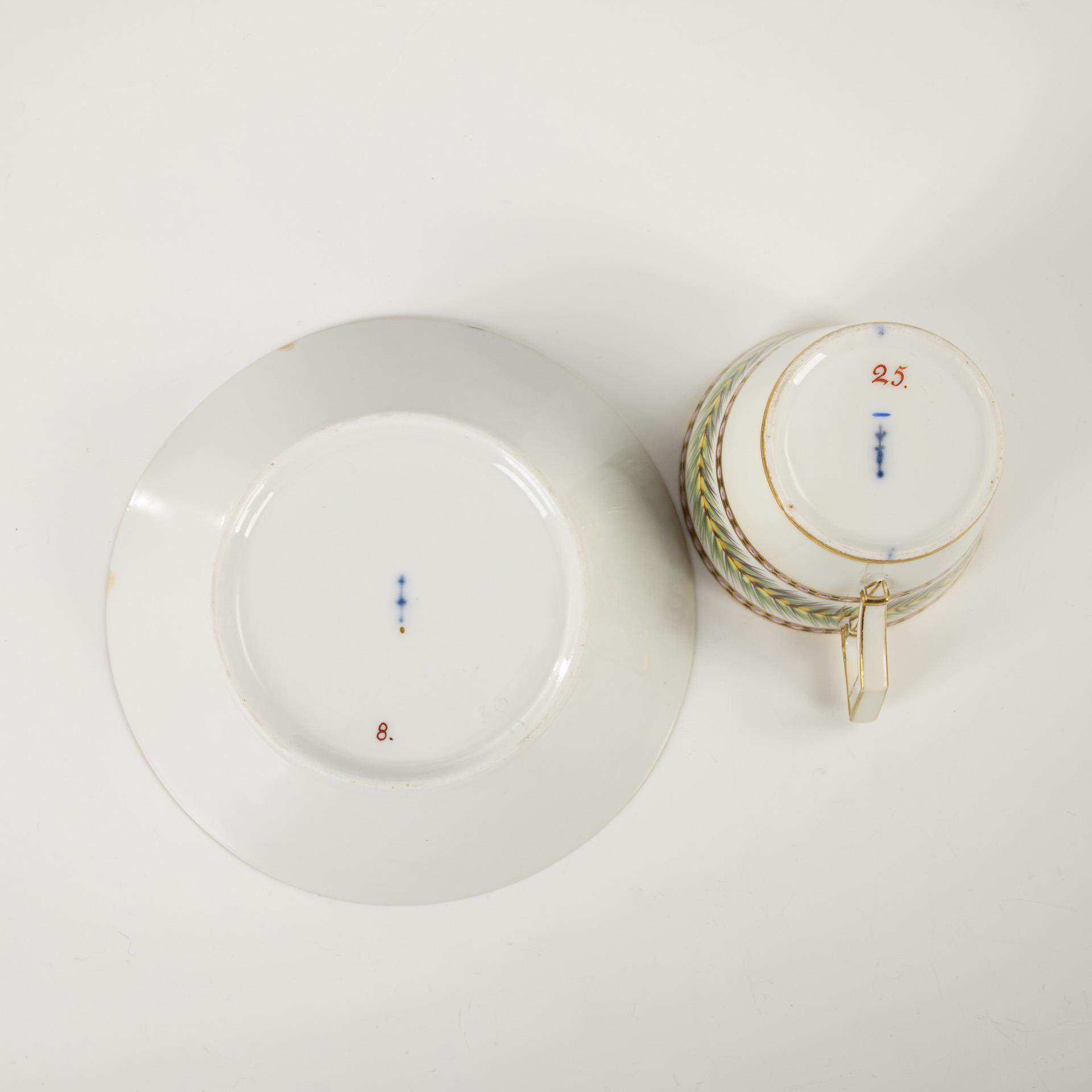 Polychrome painted, decorated in gold. Cup (h 6 cm), original saucer (Ø 13 cm).