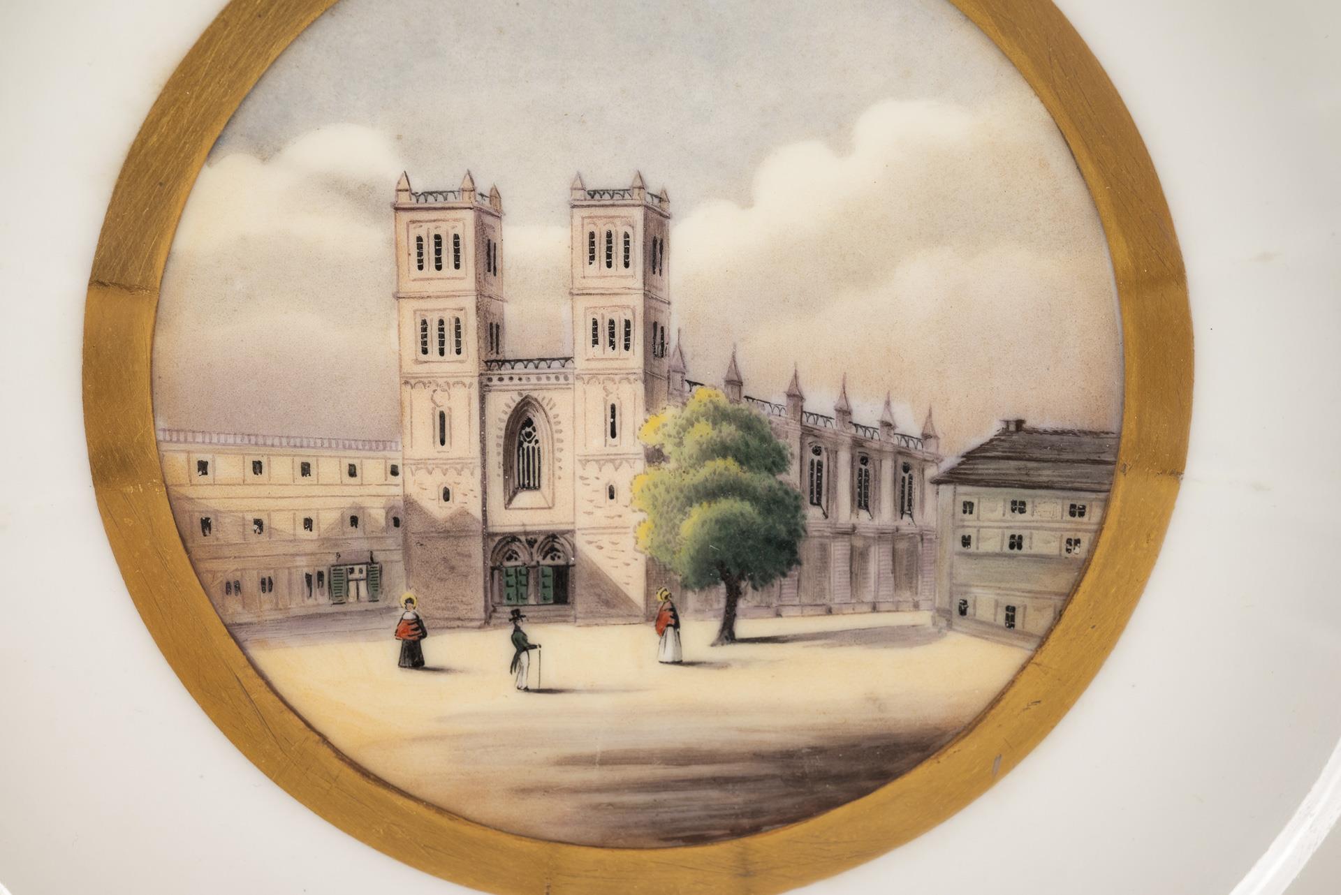 Model "Antikzierat". "Wroclaw City Palace" decoration. In the mirror a gold-framed medallion with a view of the Friedrichswerder Church in Berlin. 3 minimal, underside edge chips.
