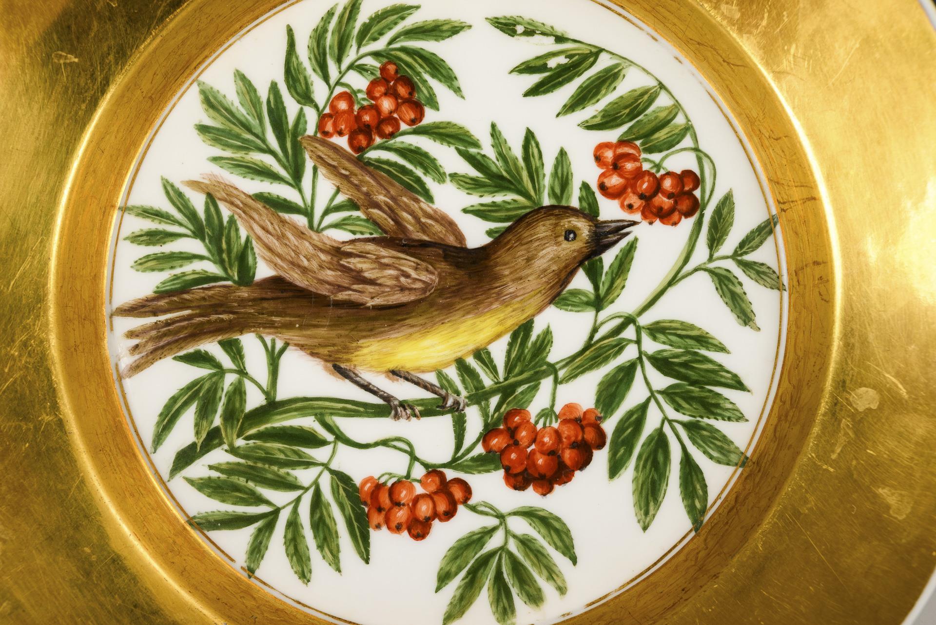 Model "Conical". Golden flag base. In each mirror the depiction of a bird, 1x sitting in a rowan tree and 1x in a rose bush.