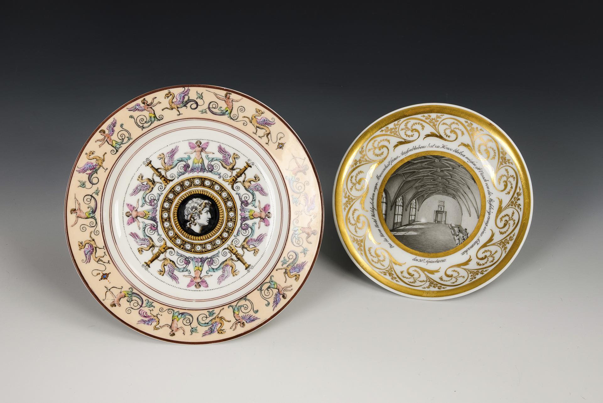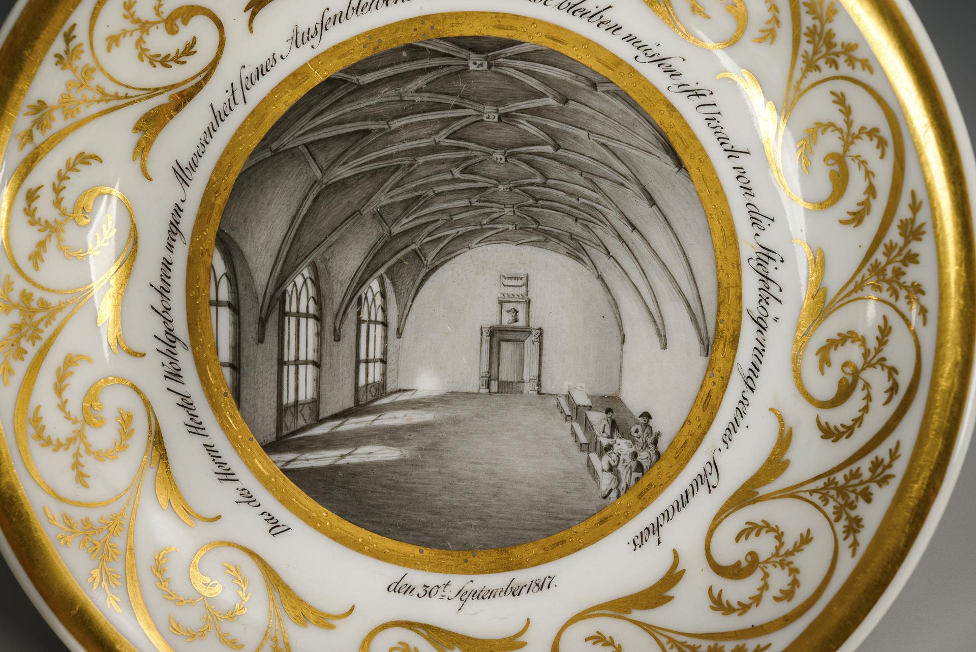 1x saucer, sceptre mark, 1817: the mirror of the saucer depicts a Gothic room with a ribbed vault and table company, inscribed "Das des Herrn Hertel Wohlgebohren wegen Abwesenheit seines Außenbleibens hat zu Hause bleiben muß ist Ursach von die Stiefelzögerung seines Schumachers.". / 1x plate, sceptre mark, penny mark and red imperial orb, 1849-1870: grotesque motifs in the mirror and on the flag as colorful overprint decoration. Restored saucer.