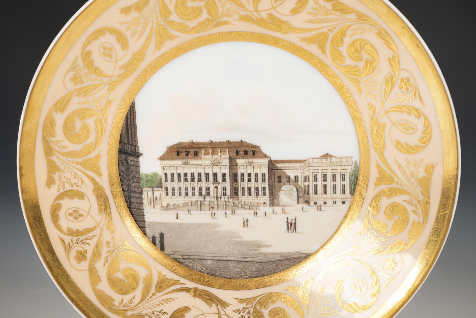 In the mirror a view of the Kronprinzenpalais Unter den Linden in Berlin, on the flag gold-engraved tendrils on an apricot-colored background. Rim chip on the underside (Ø approx. 9 mm).