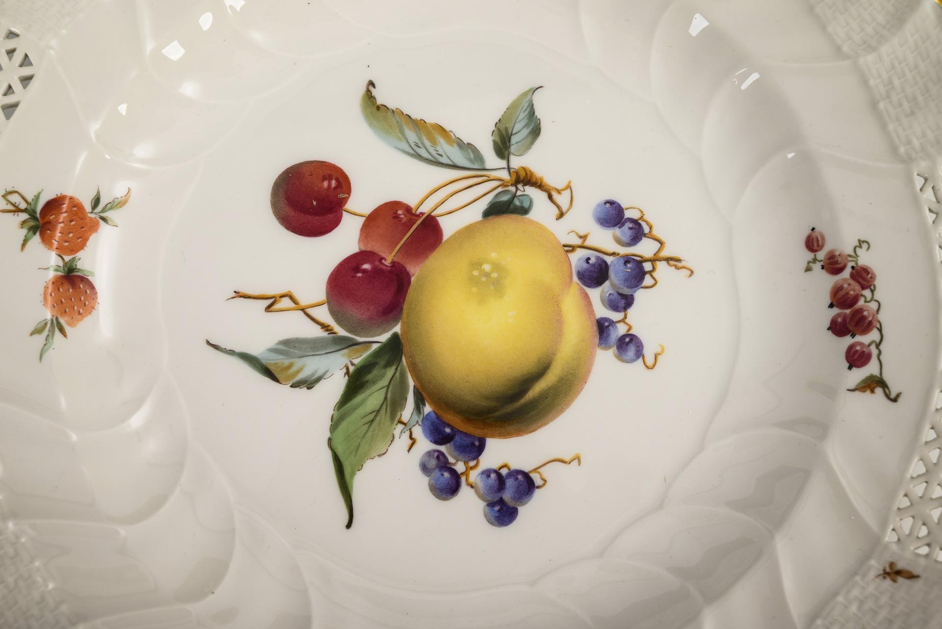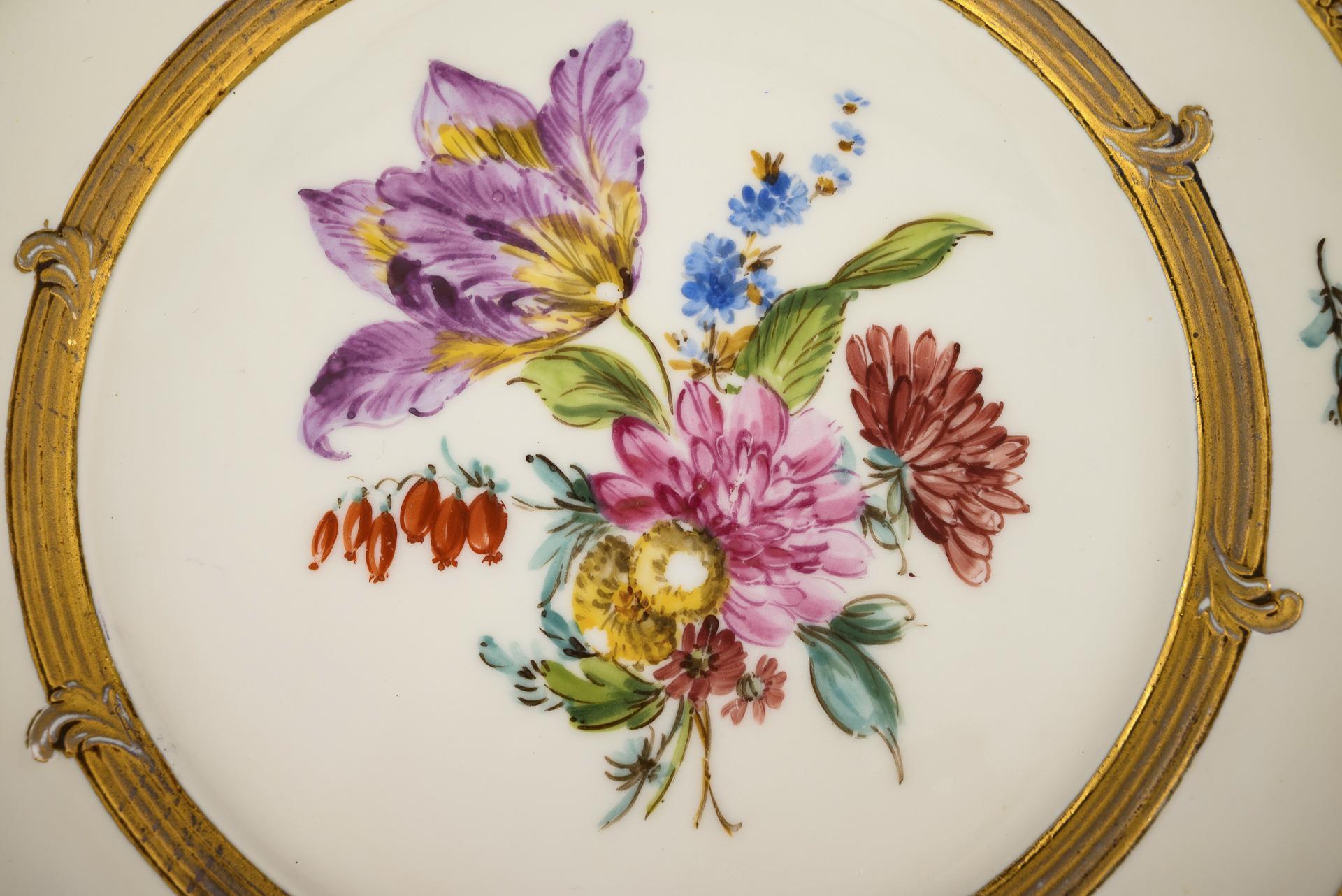 1x "Antikzierat" model, house painting: dinner plate with a pair of blue tits / 1x "Neuozier" model with cut-out: dessert plate with fruit painting / 1x with gold-bronze borders and a bouquet of flowers. Partial gold abrasion.