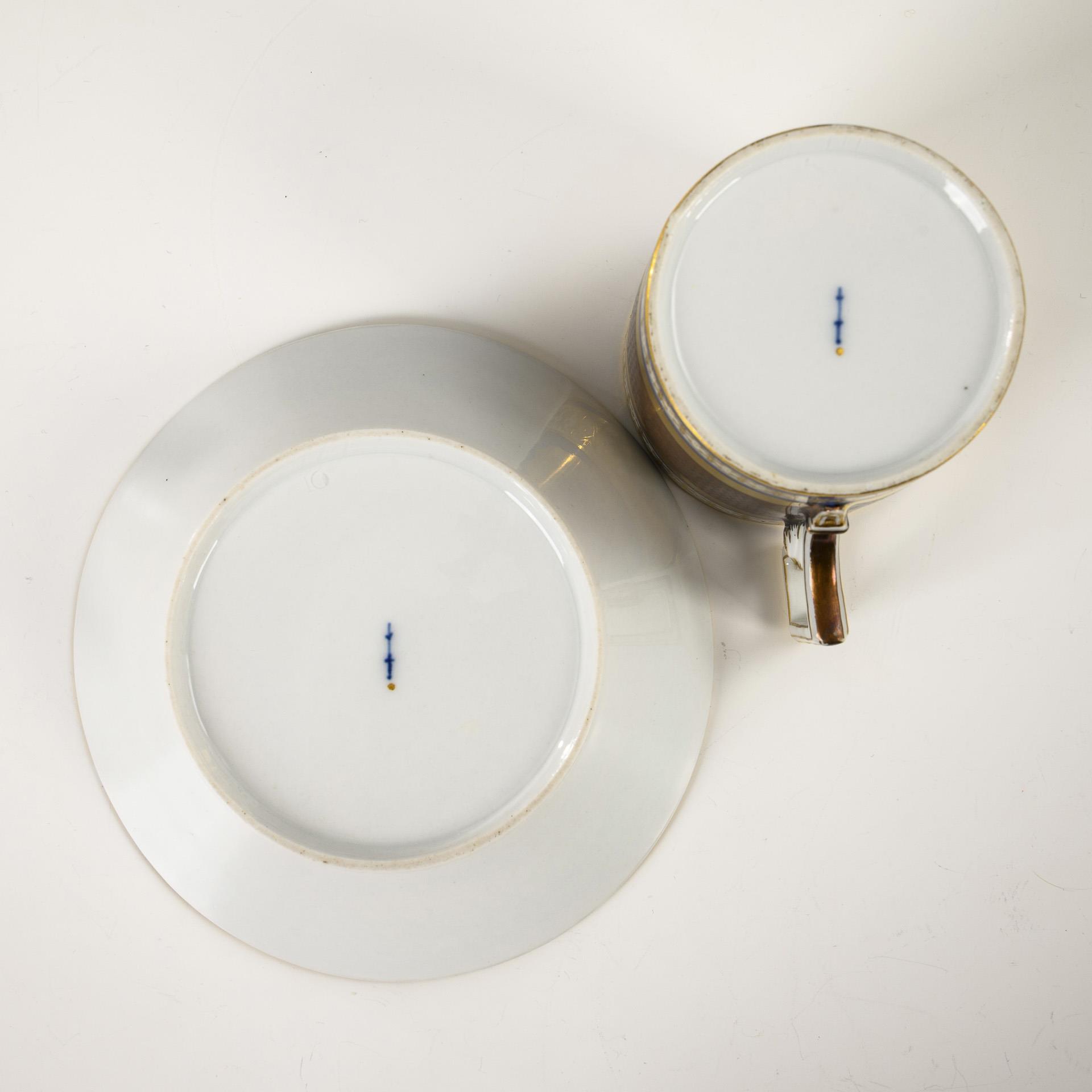 Polychrome painted, decorated in gold. Cup (h 7 cm), original saucer (Ø 13.5 cm).