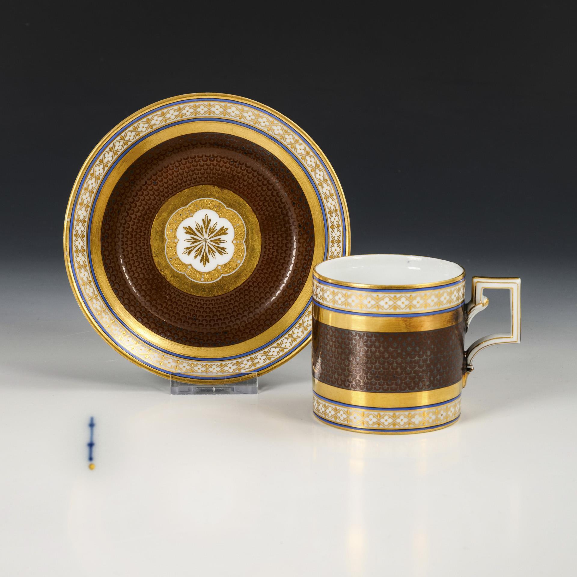 Cylinder cup with angled handle. Between golden stripes a brown background band with silver-painted scale pattern, ornamental gold border on rim and stand.