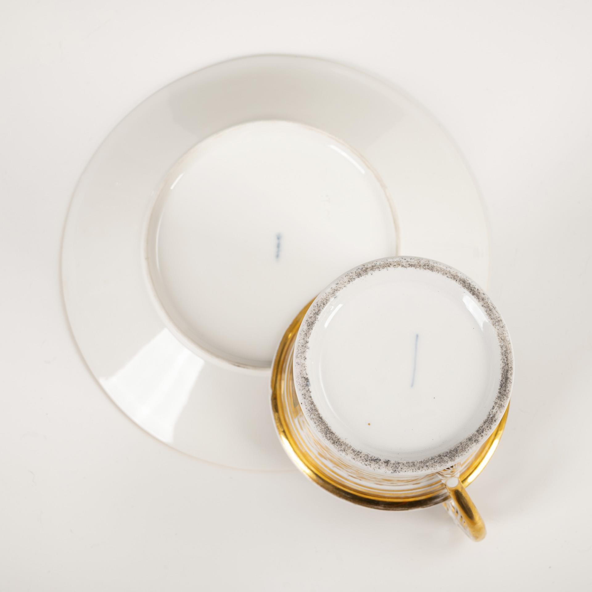 Polychrome painted, decorated in gold. Cup (H 12 cm), completed saucer (Ø 18.5 cm).