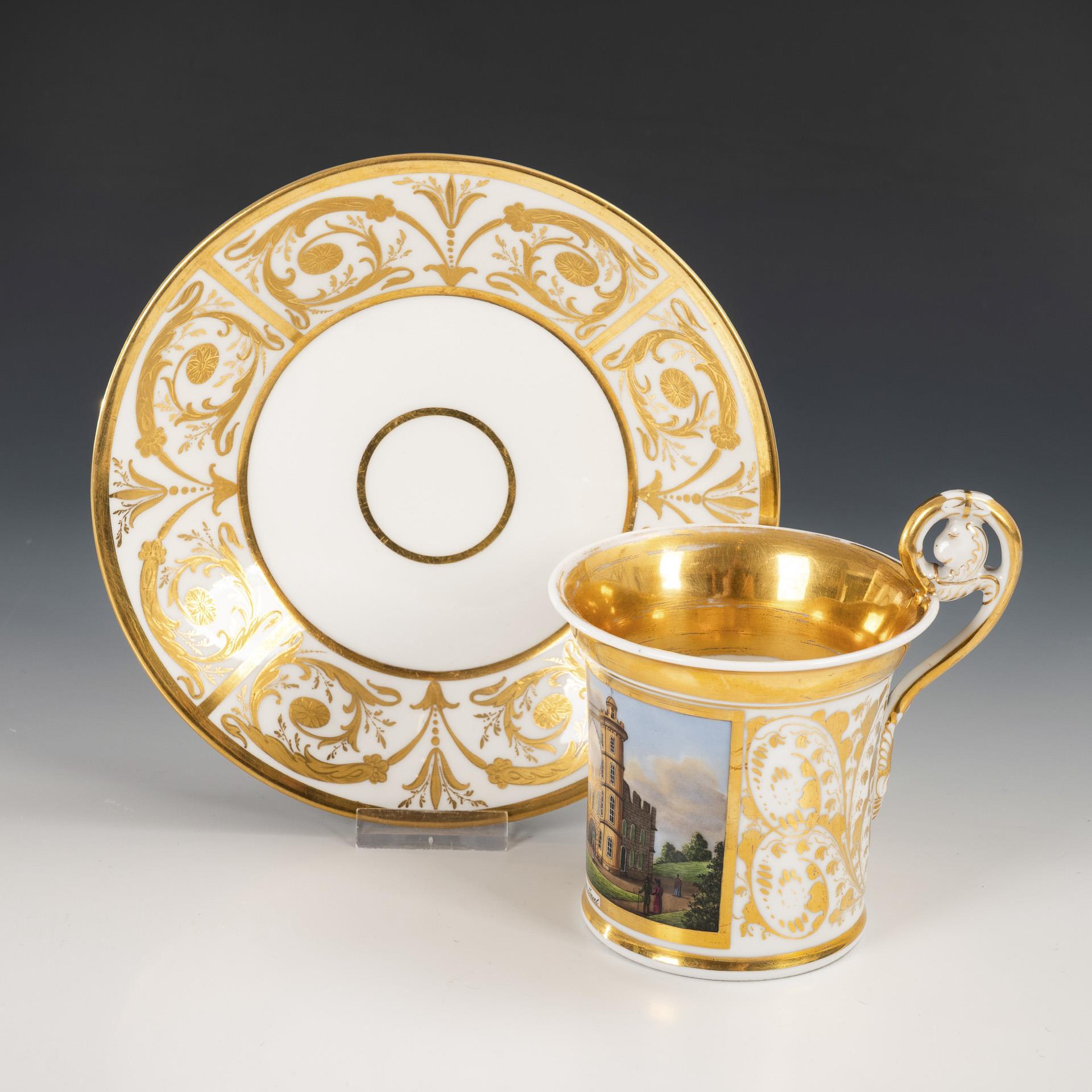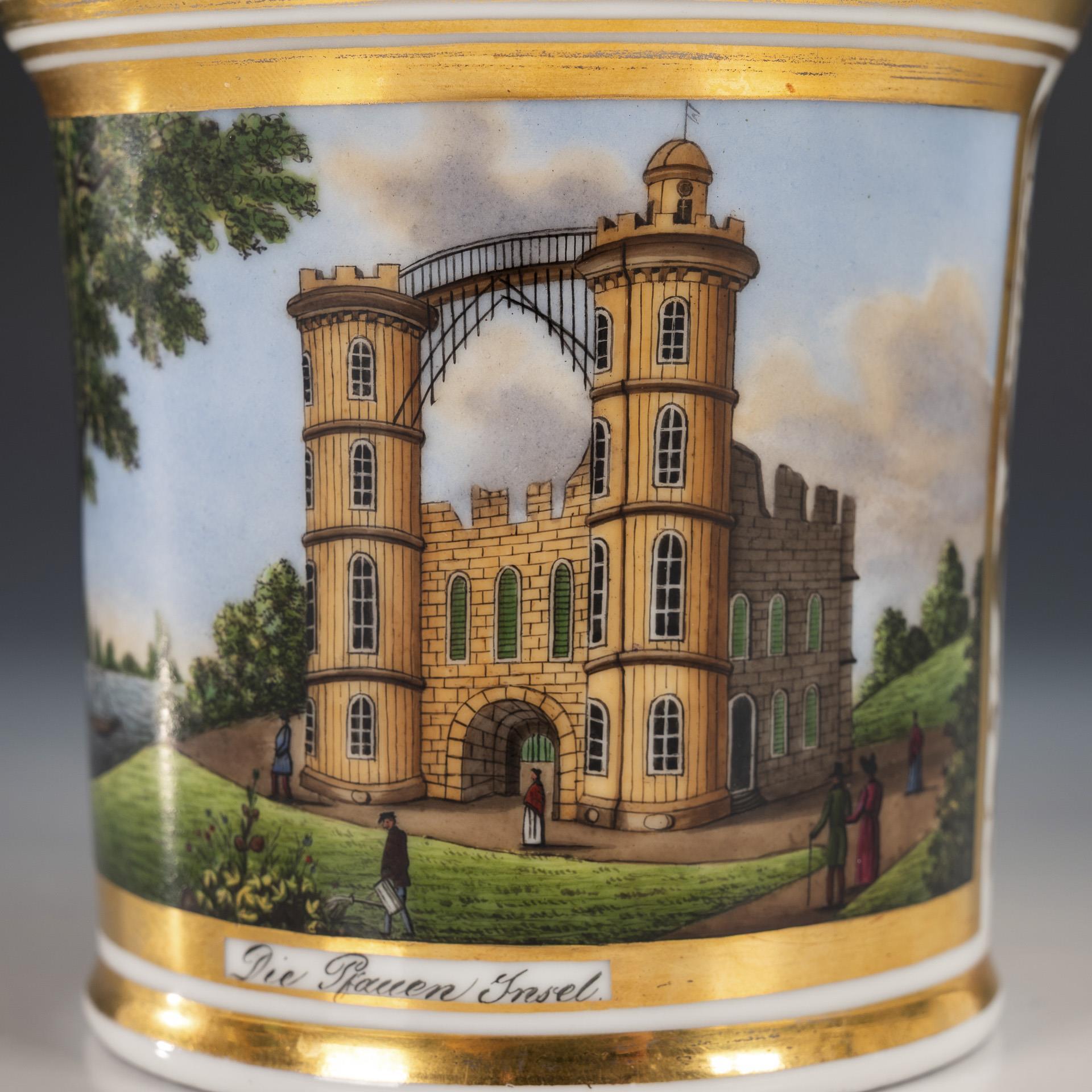Cylinder cup with crater rim and lion's head handle. On the front a gold-framed rectangular cartouche with the inscribed view of the palace on Peacock Island near Potsdam, verso vegetal gold painting. Partial gold abrasion, hairline crack at the top of the handle.
