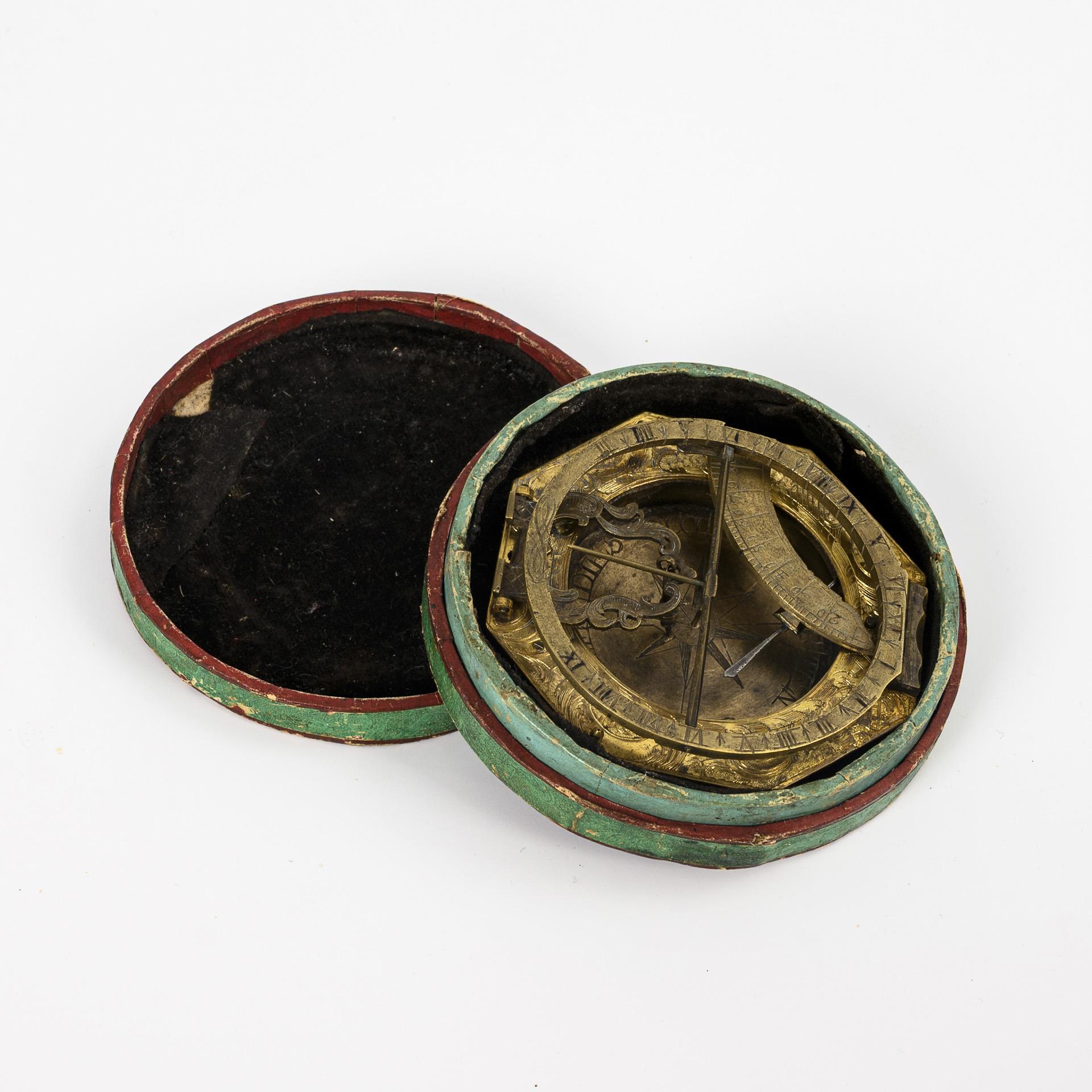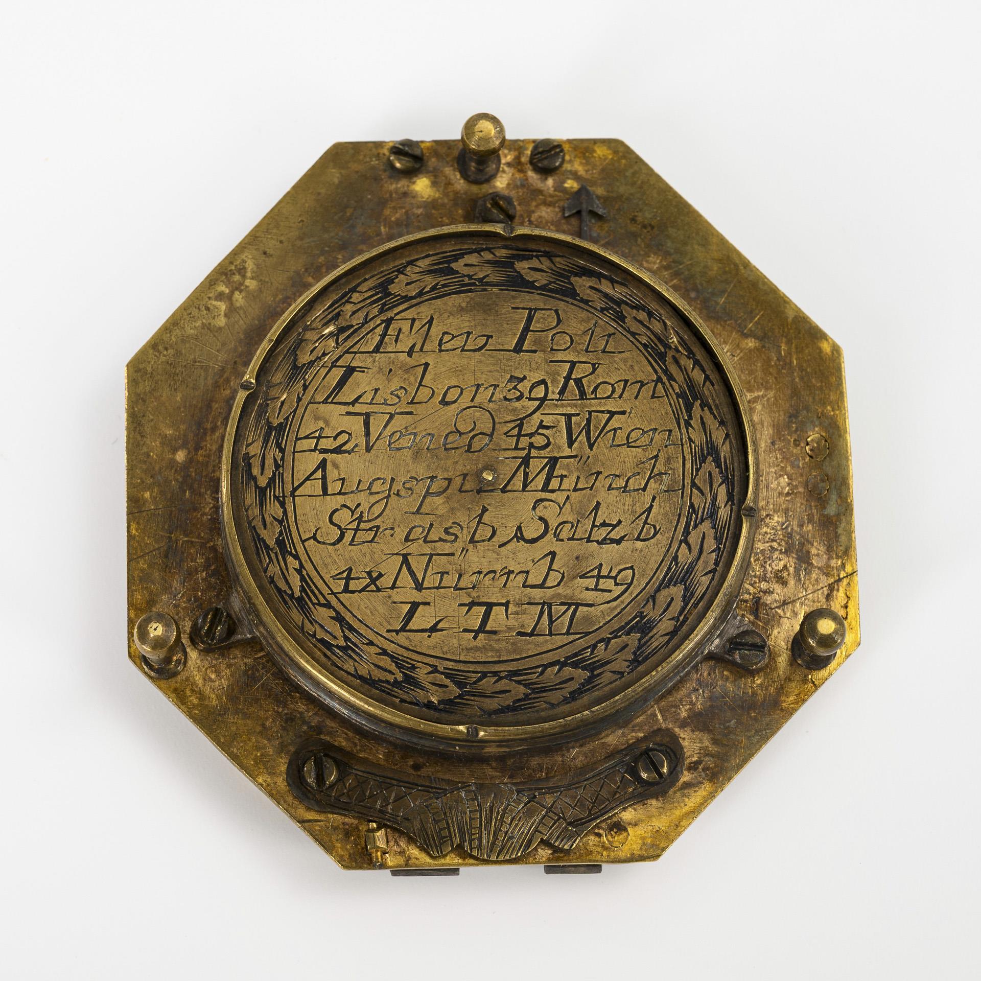 Folding sundial with finely engraved octagonal base plate around the compass. Openable latitudo degree arch, equatorial ring with Roman hour markers, hinged pole in the ring as a shadow caster (gnomon). Hinged holder with engraving for the plumb bob. Engraved city names on the compass base (e.g. Lisbon, Rome, Venice, Vienna, Munich, Strasbourg, Salzburg and Nuremberg) with the respective latitude. Glass plate missing (original compass needle present), compass base rubbed.