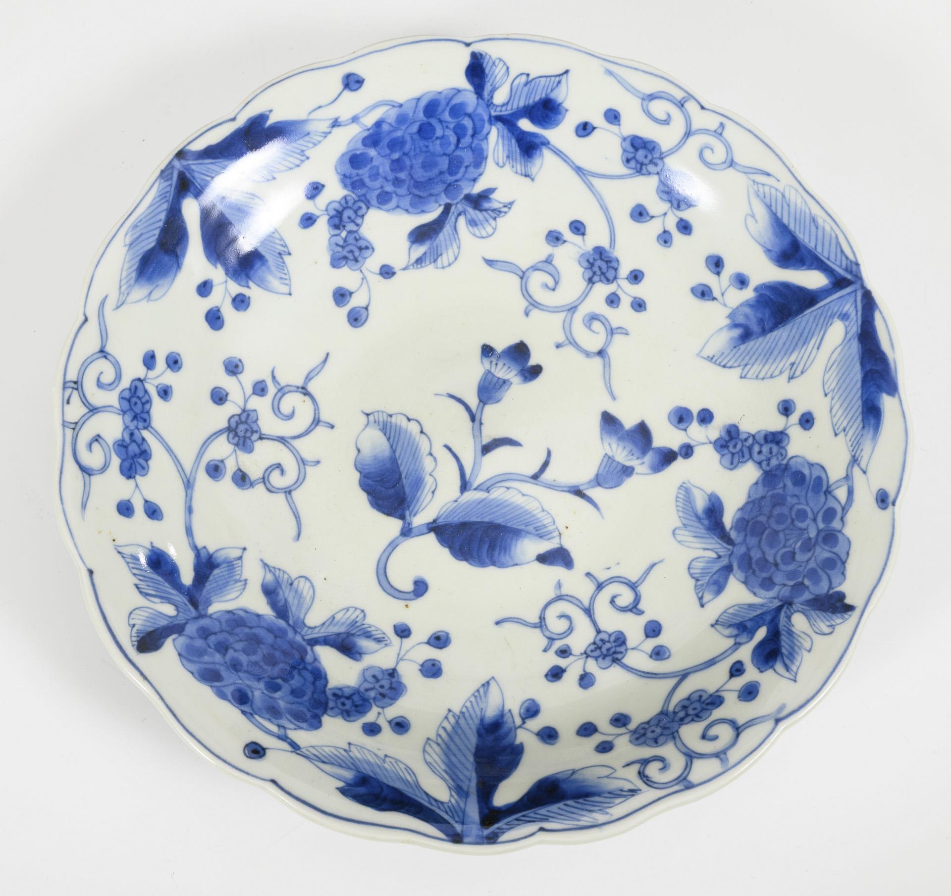 Deep plate with floral decoration with six-character mark. Ø 24.5 cm. / Shallow plate with floral decoration and narrow brown rim, Ø 22 cm. / Imari plate with blue and red decoration, Ø 23 cm.