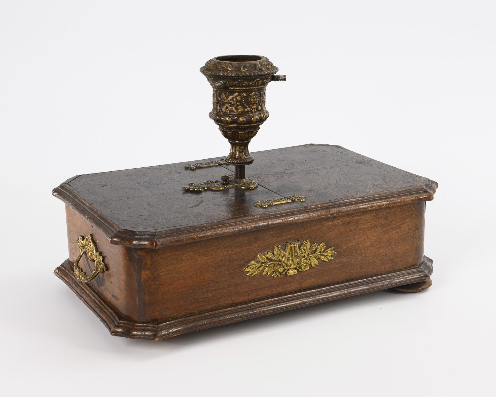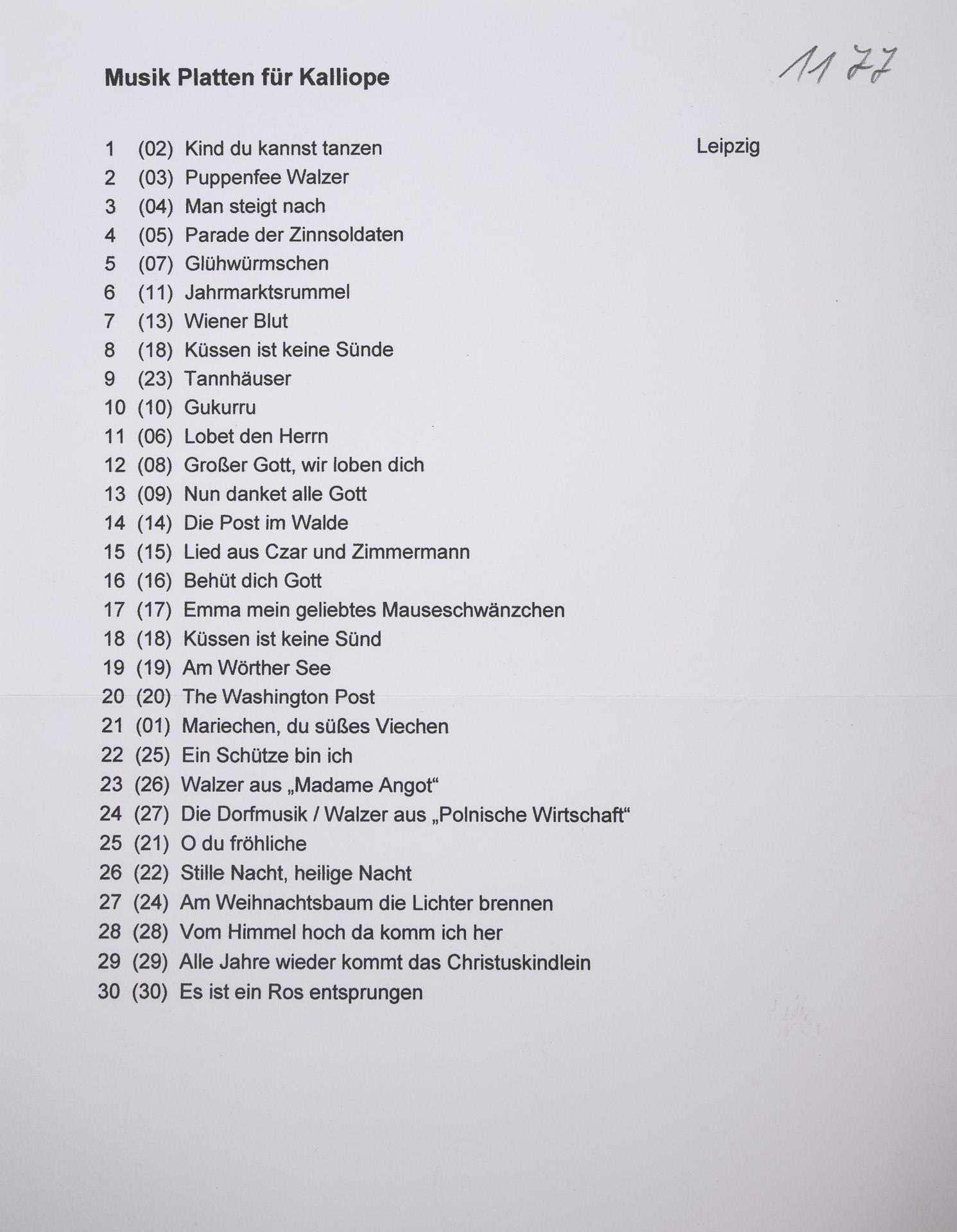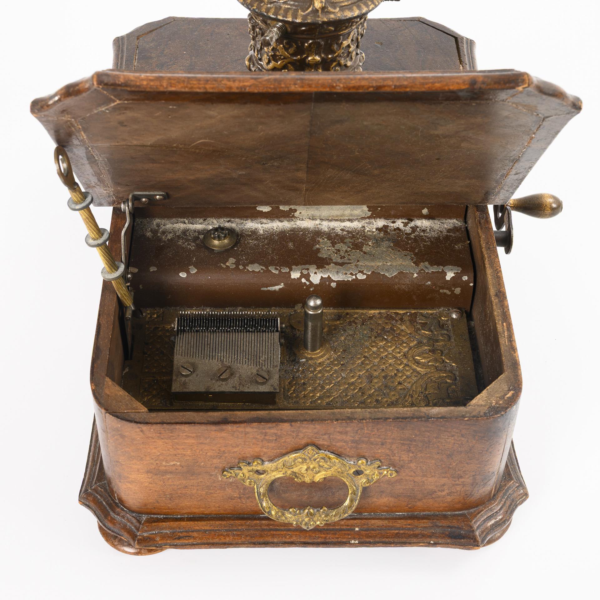 A "music box" with rounded corners and curved moldings, standing on pressed ball feet, with brass fittings in rich relief on all sides and on the hinged lid. Removable tree holder on the lid with rich relief decoration, whereby the holder rotates when the music is played. Crank winding mechanism and adjusting lever on one long side. Unmarked perforated plate musical mechanism with a starter wheel on the reed comb and rim drive for the perforated plates. Perforated plates with serrated edge each marked "Kalliope"; e.g. Kind du kannst tanzen, Puppenfee Walzer, Parade der Zinnsoldaten, Glühwürmchen, Wiener Blut, Behüt dich Gott and some Christmas carols. Case partly stronger signs of age/use, plates partly slight rusting, runs and plays with some background noises.