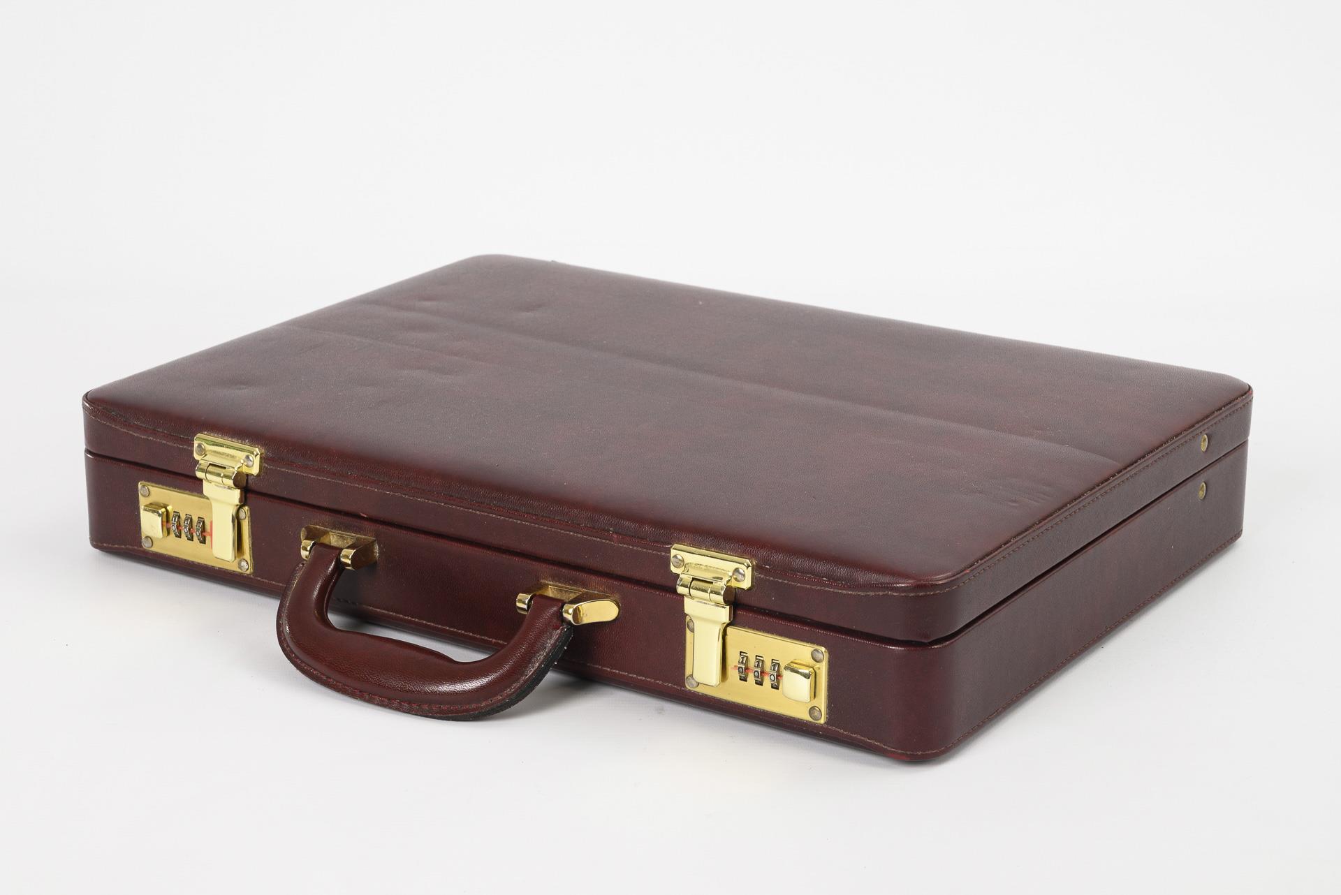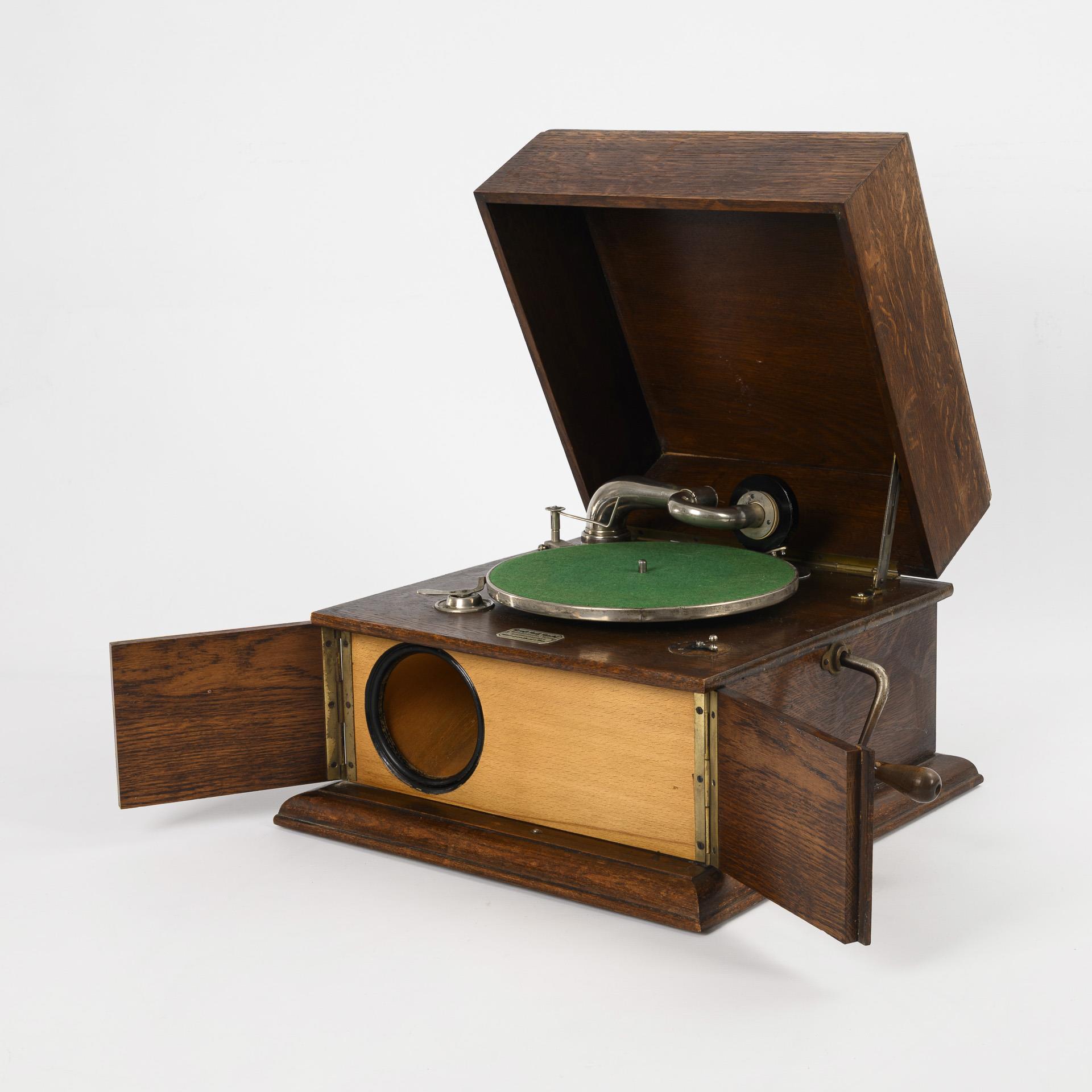 Solid oak, shellac records in often original paper sleeves, red leatherette case. 30 x 42 x 42 cm, case 35 x 45 x 8 cm. Total weight 16.8 kg.