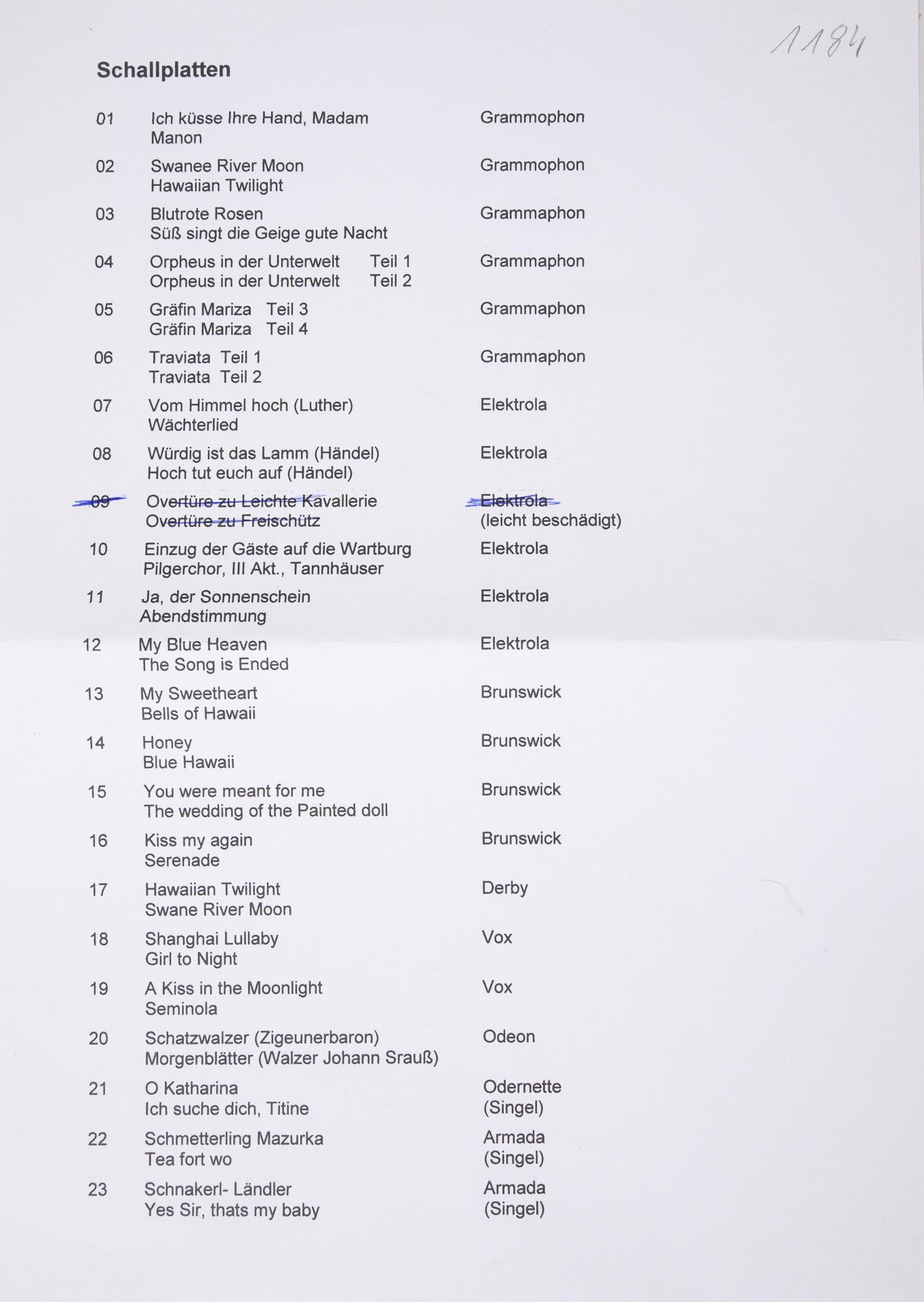 Gramophone with hinged lid and 2 front doors for the integrated sound funnel made of beech wood. Turntable covered with green felt, "luxury" sound box, speed regulator, brake and automatic switch-off. In the red case, shellac records from various companies (Grammophon, Elektrola, Brunswick, Derby, Vox etc.) e.g. Ich küsse ihre Hand Madame, Swanee River Moon, Blutrote Rosen, Orpheus in der Unterwelt, Gräfin Mariza, Traviata, Vom Himmel hoch, etc.. Enclosed 1 crank, 1 velvet cushion, 1 tin box "Herold-Sortiment" with needles. Overhauled, works with beautiful sound.