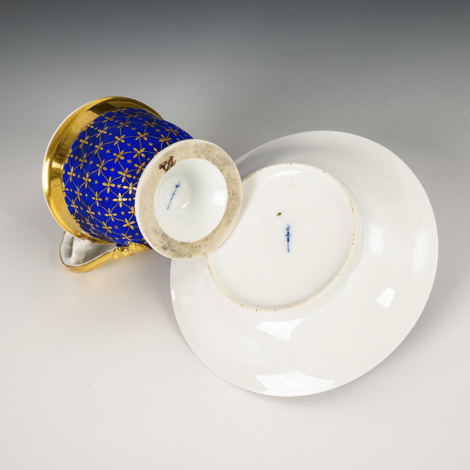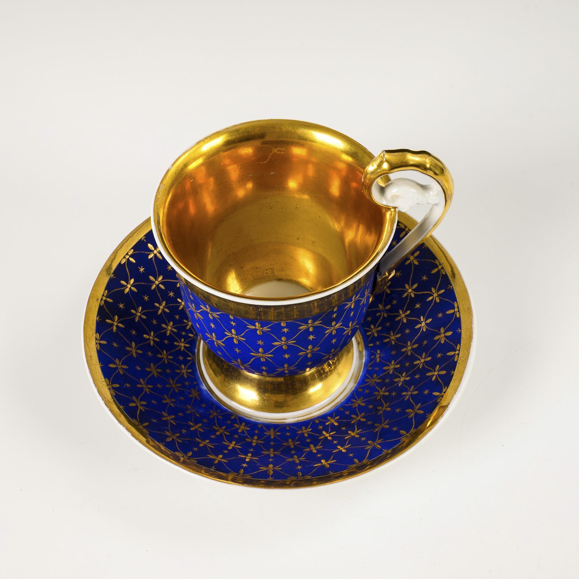 Footed bell-shaped cup with leaf handle. Royal blue, matt ground with gold-painted floral and star pattern, gilt interior. Minimal gold wear to the mirror of the saucer.