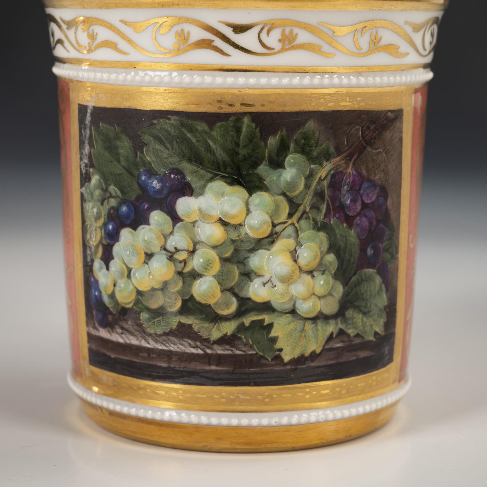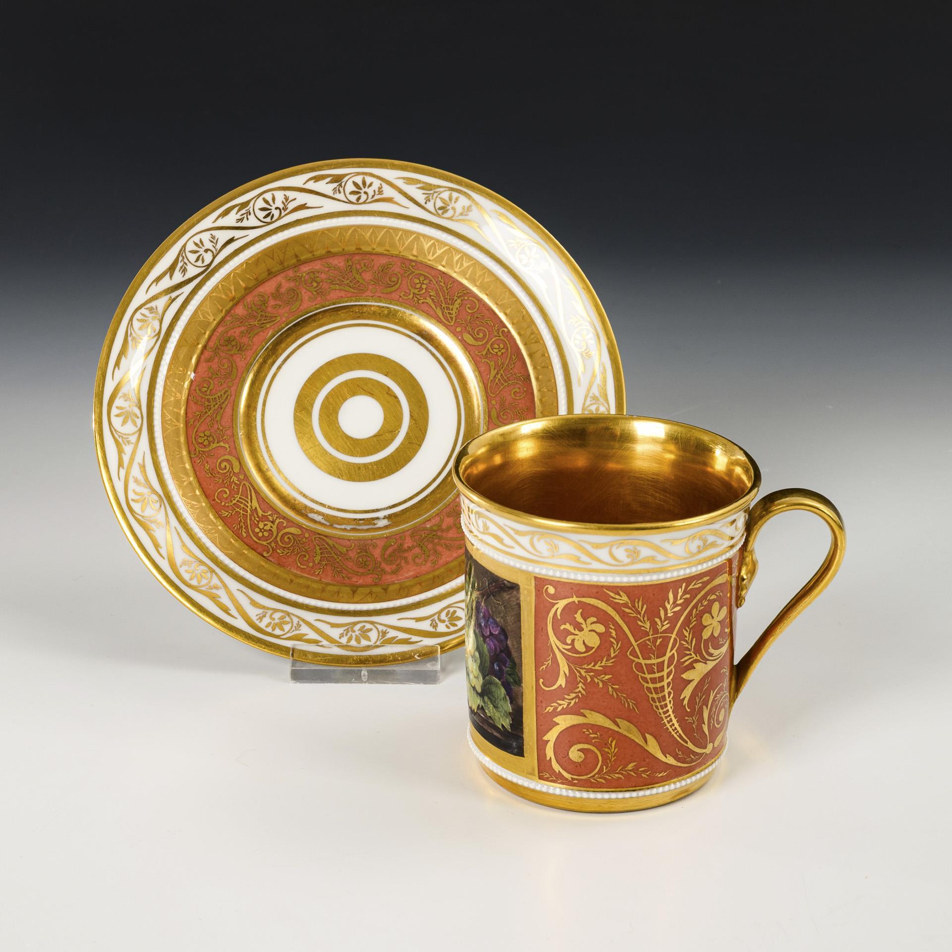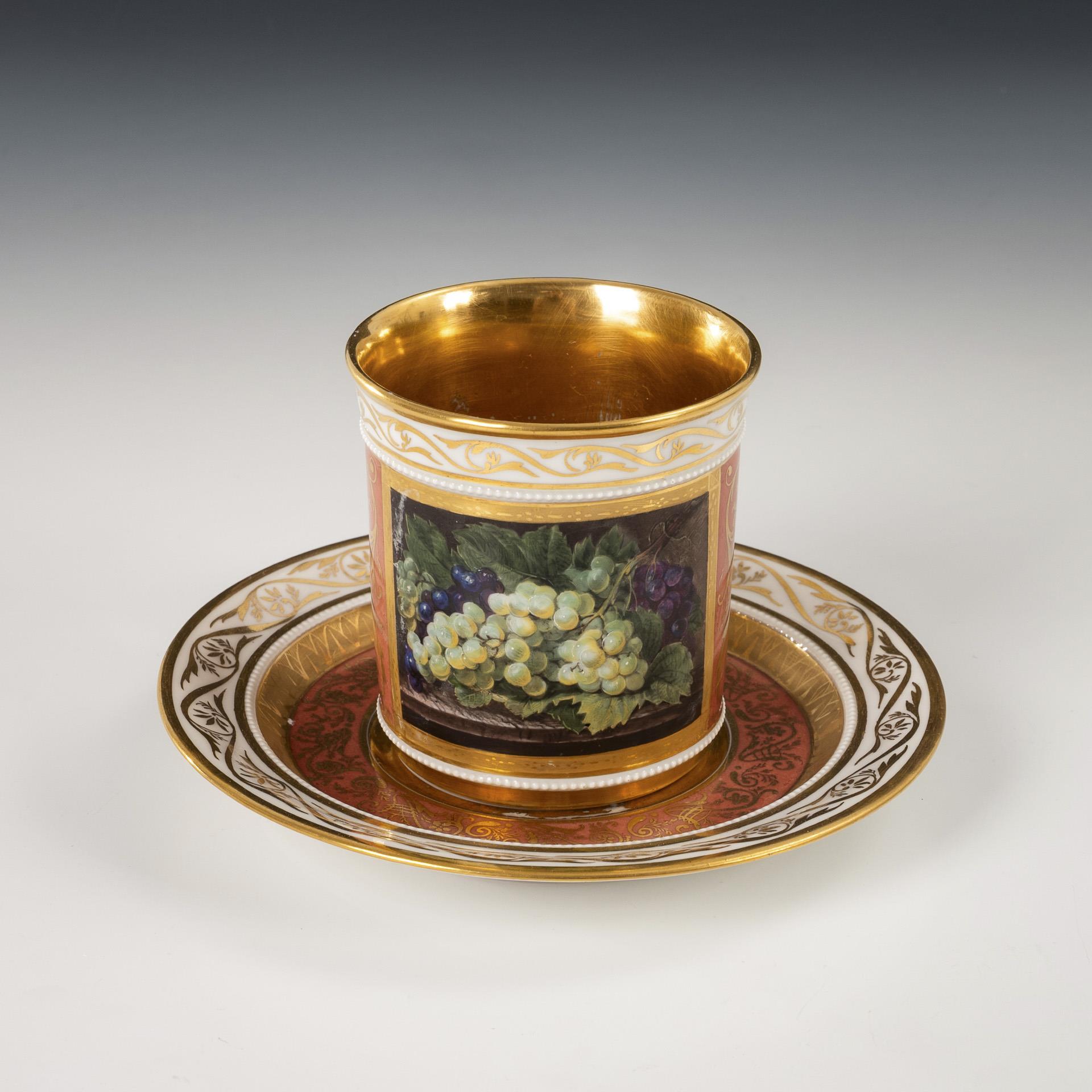 Cylinder cup with ear handles and pearl bands. Under a vegetal gold border a rectangular cartouche on the front depicting white and blue grapes on a wooden table, verso rust-red ground with gold floral painting, gilded inside. Bottom of the cup restored on the underside.
