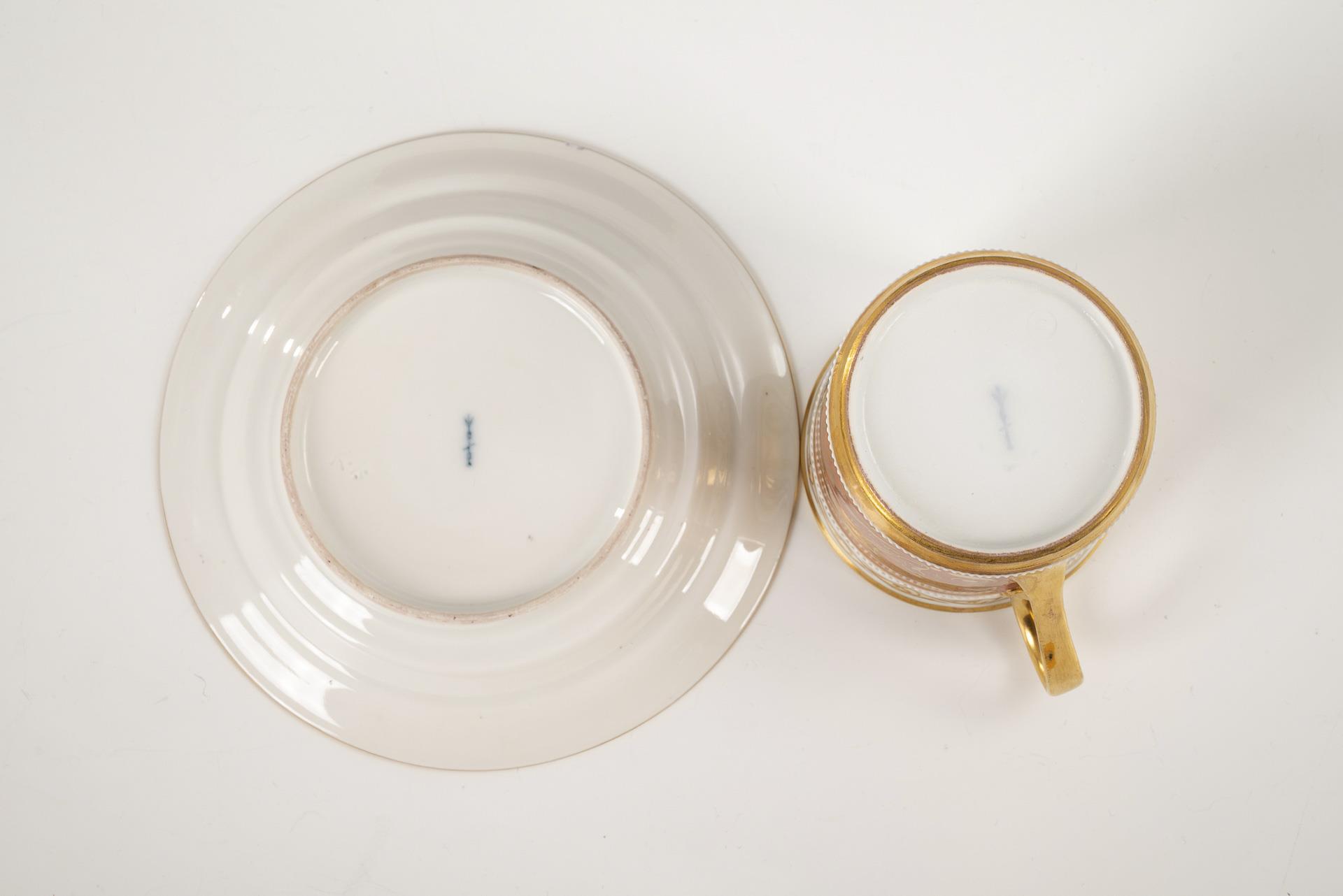 Polychrome painted, decorated in gold. Cup (h 8 cm), original saucer (Ø 15 cm).