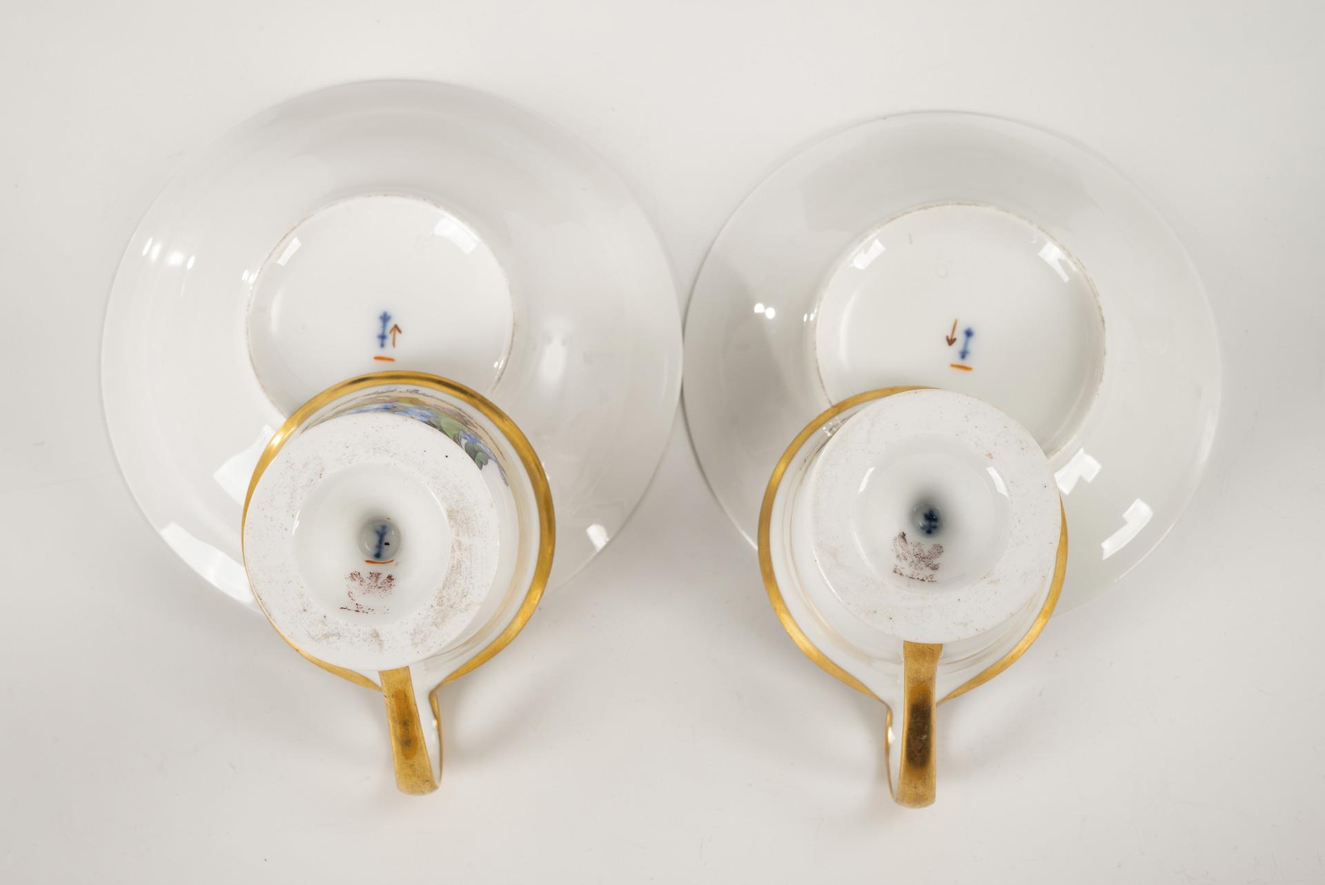 Polychrome painted, decorated in gold. 2 cups (h approx. 10 cm), 2 added saucers (Ø 13.5 and 14.5 cm).