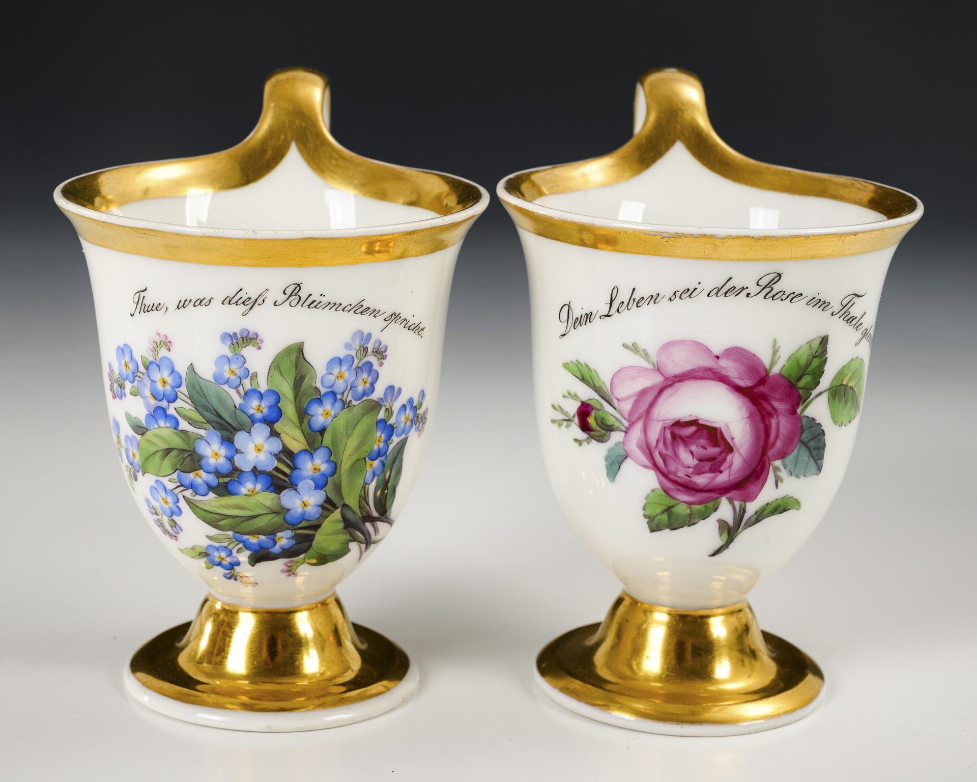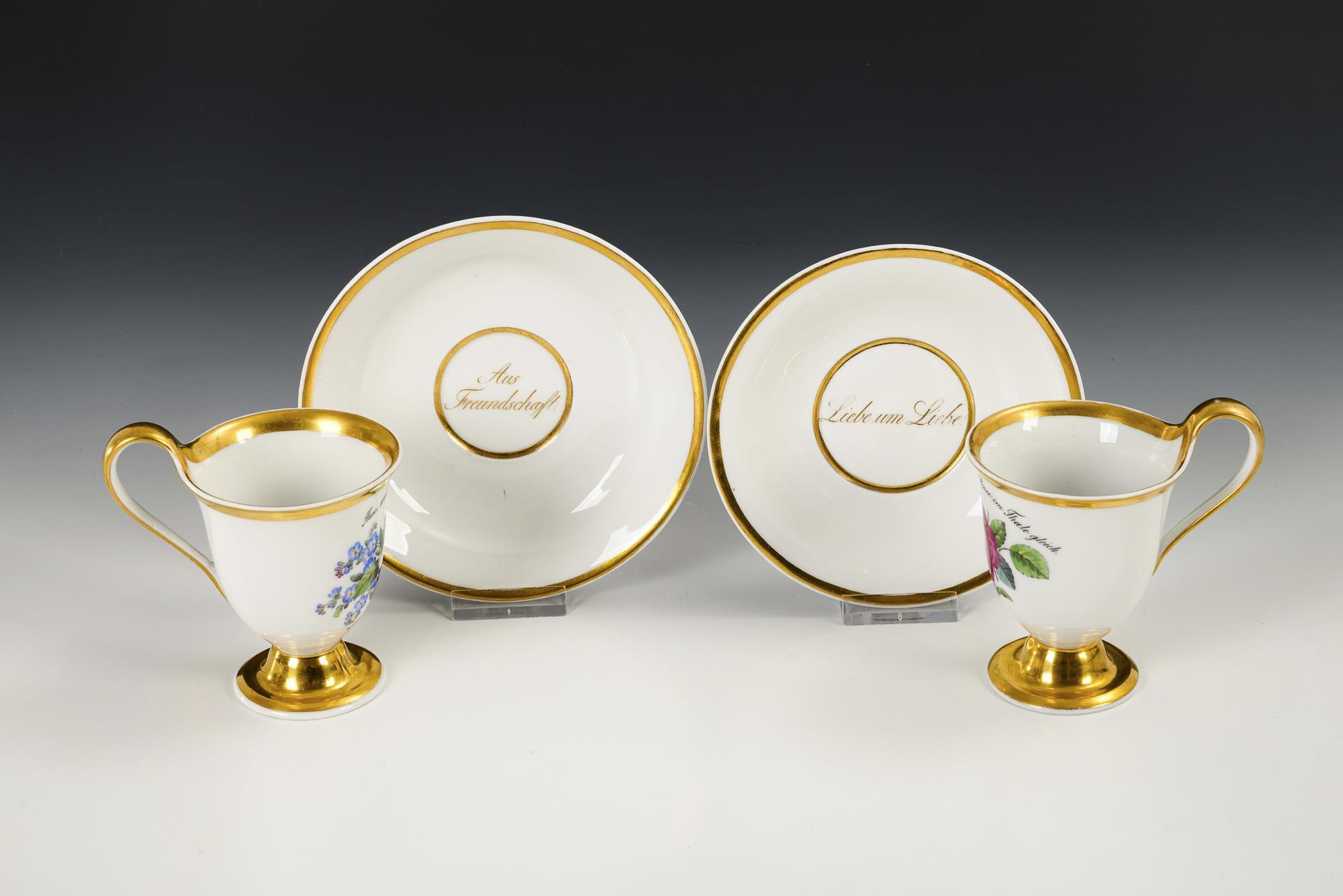 Footed bell-shaped cups with high curved ear handles. 1x with a depiction of a bouquet of forget-me-nots on the front with the inscription "Thue, was dieß Blümchen spricht; 1x with a depiction of a rose and the inscription "Dein Leben sei der Rose im Thale gleich.". In the mirrors of the saucers the inscription "Liebe um Liebe." and "Aus Freundschaft".