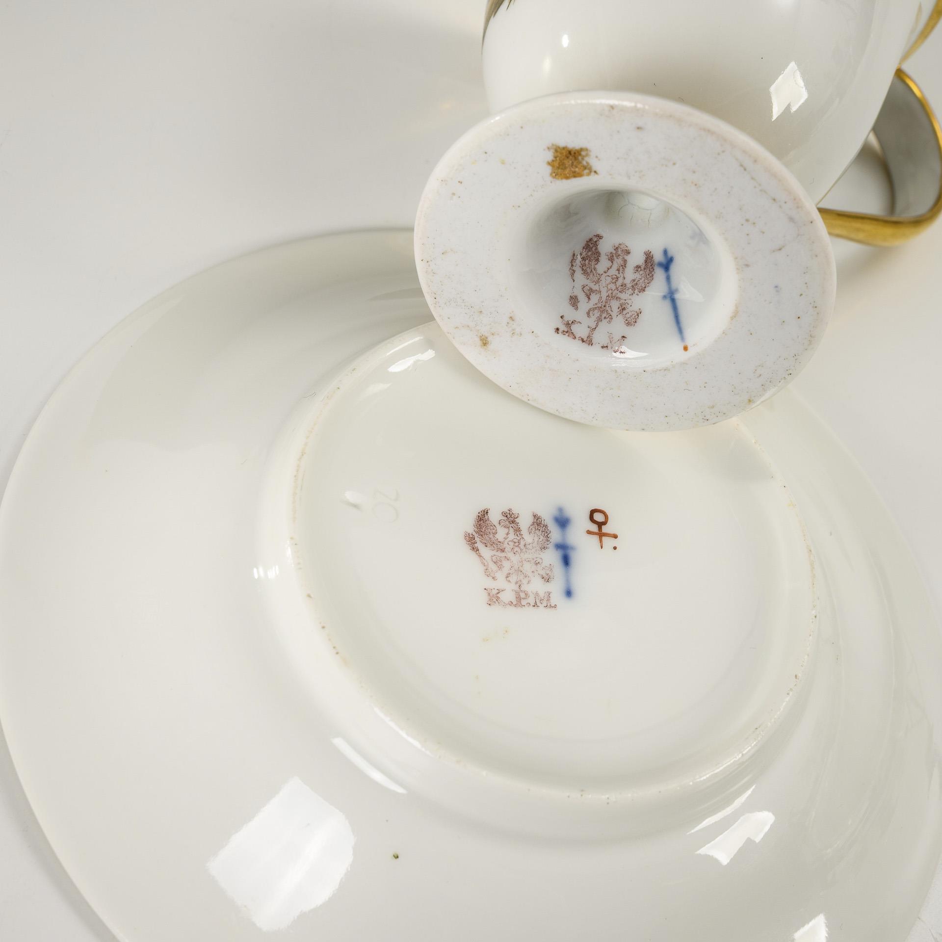 Polychrome painted, decorated in gold. Cup (h 10.5 cm), completed saucer (Ø 13.5 cm).