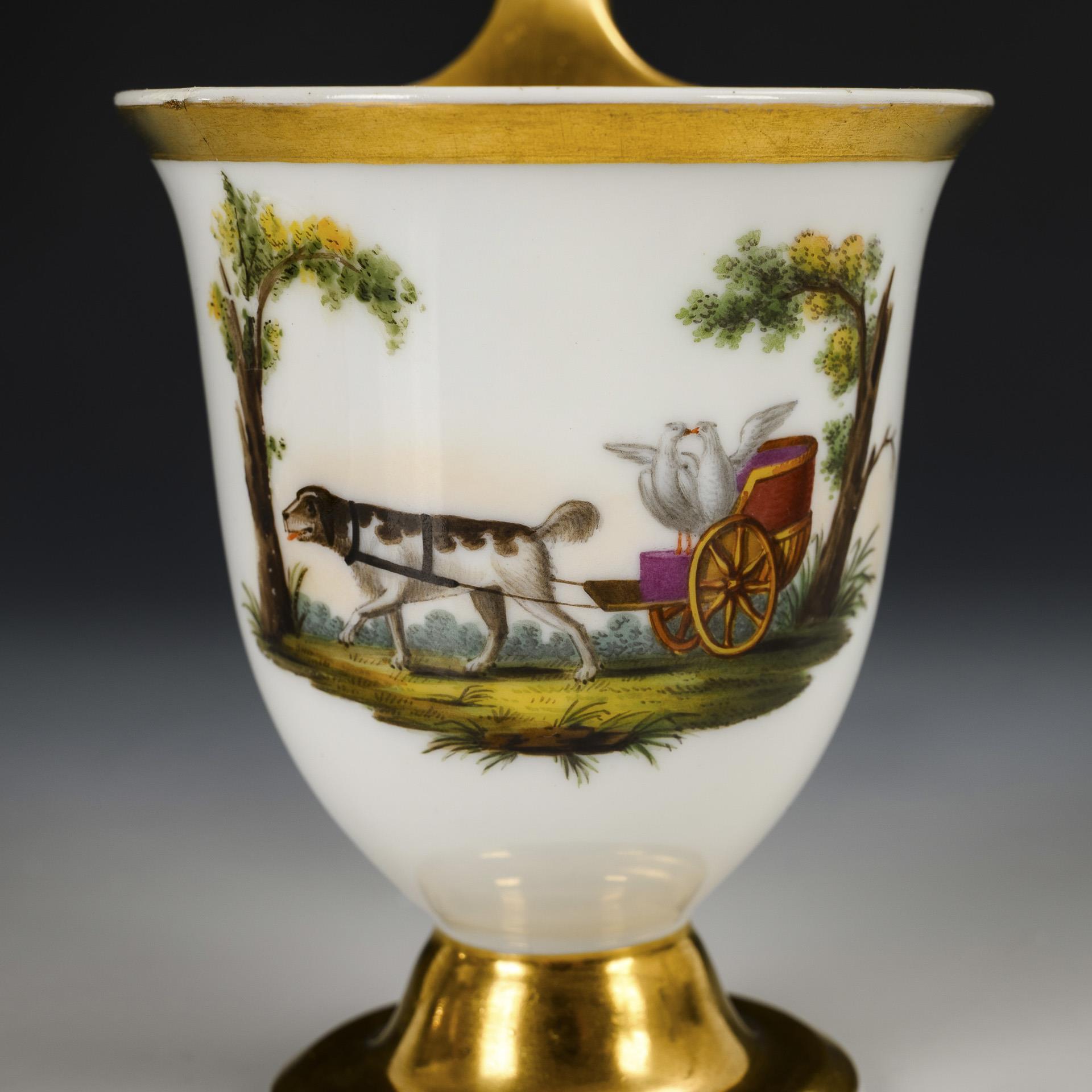 Footed bell-shaped cup with campanile handle. The front depicts a Roman chariot pulled by a dog, with two beaked doves sitting inside, the inside gilded. Hairline crack in the cup wall.