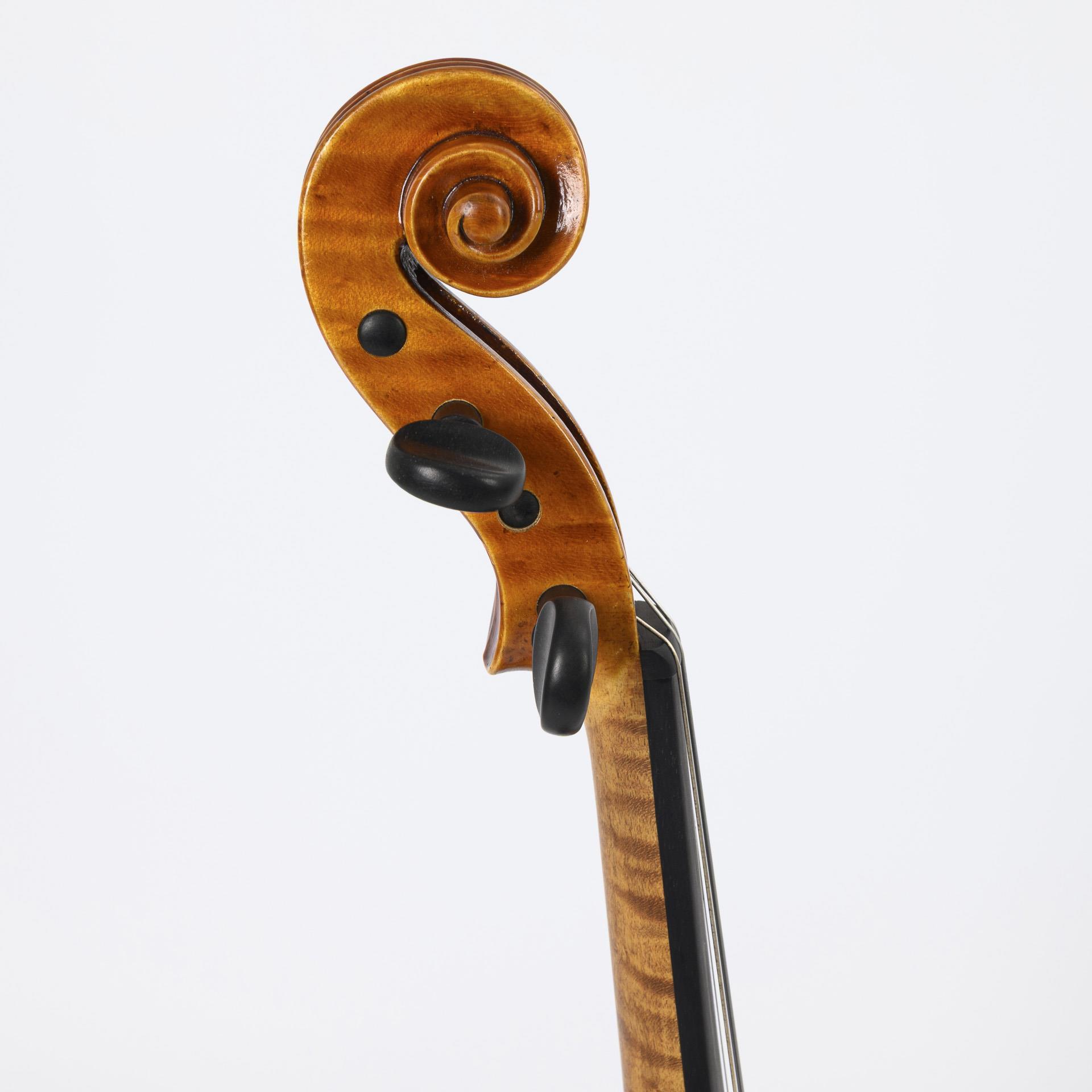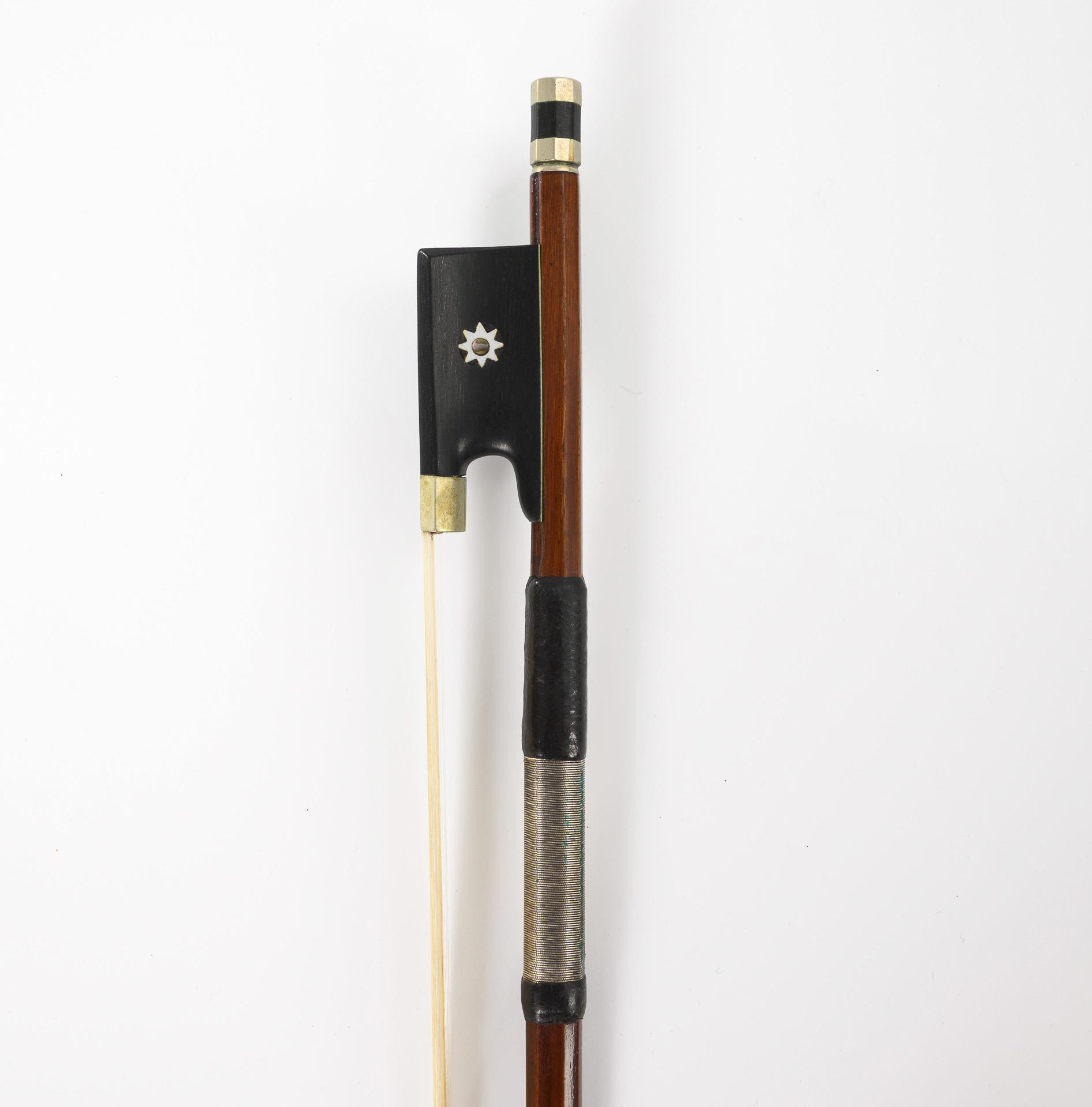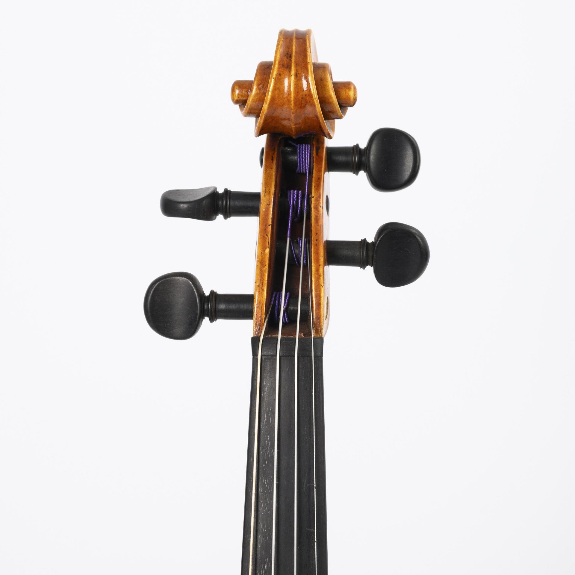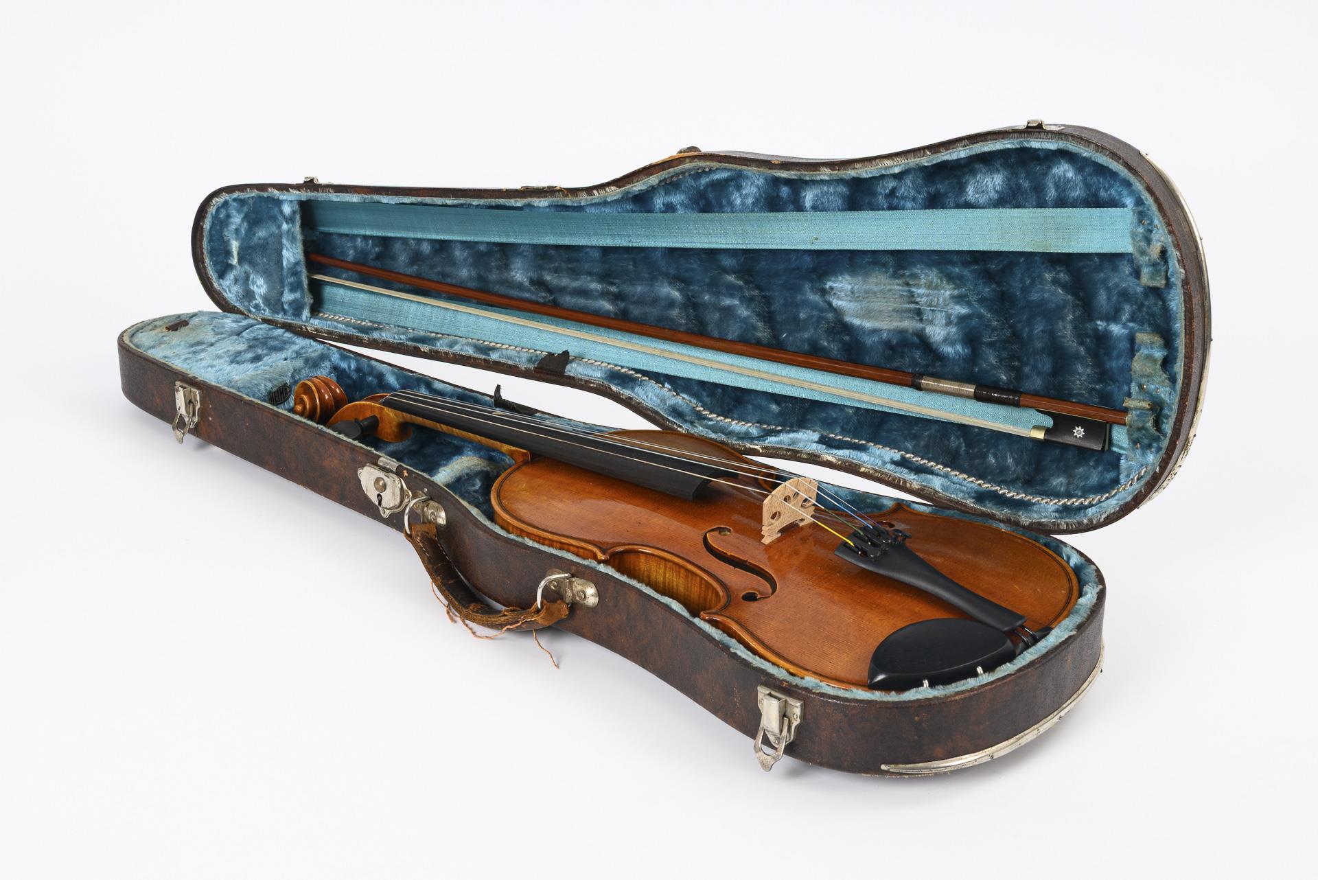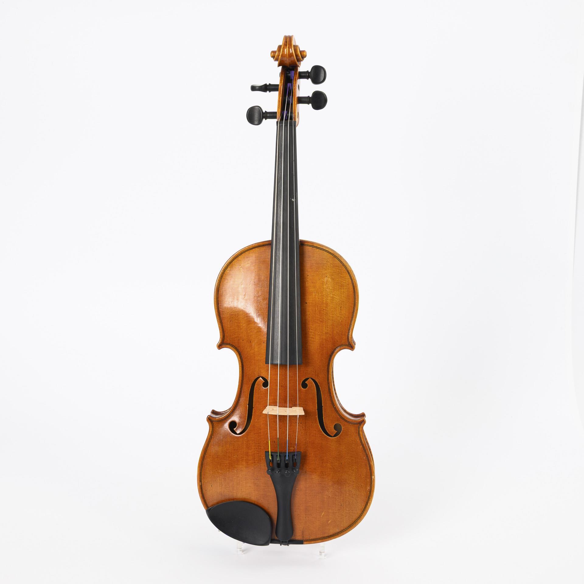 Violin and unmarked bow with star-shaped eye, additionally 1 tailpiece, 1 bridge and 1 mute. Minor superficial scratches, bow not warped. Case with some signs of age/use.