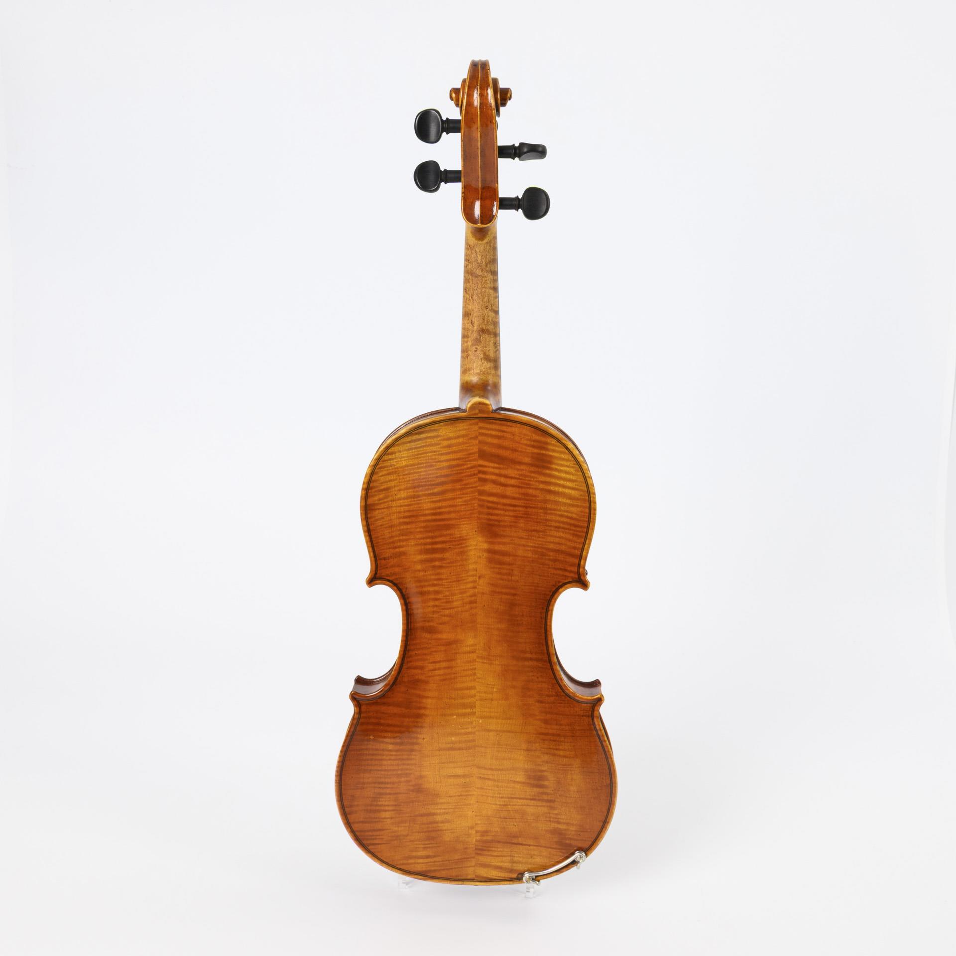 Frame and split back each flamed maple, split spruce top with 2-piece purfling, fingerboard and chinrest probably ebonized wood, plastic tailpiece. Pernambuco bow? Case with leather cover. Body 36 cm, bow 73 cm. Total weight 2.0 kg.