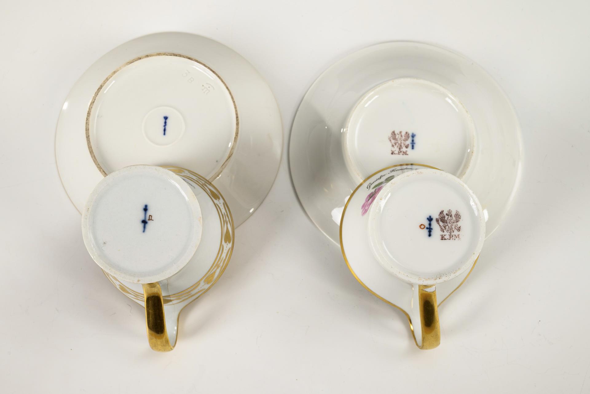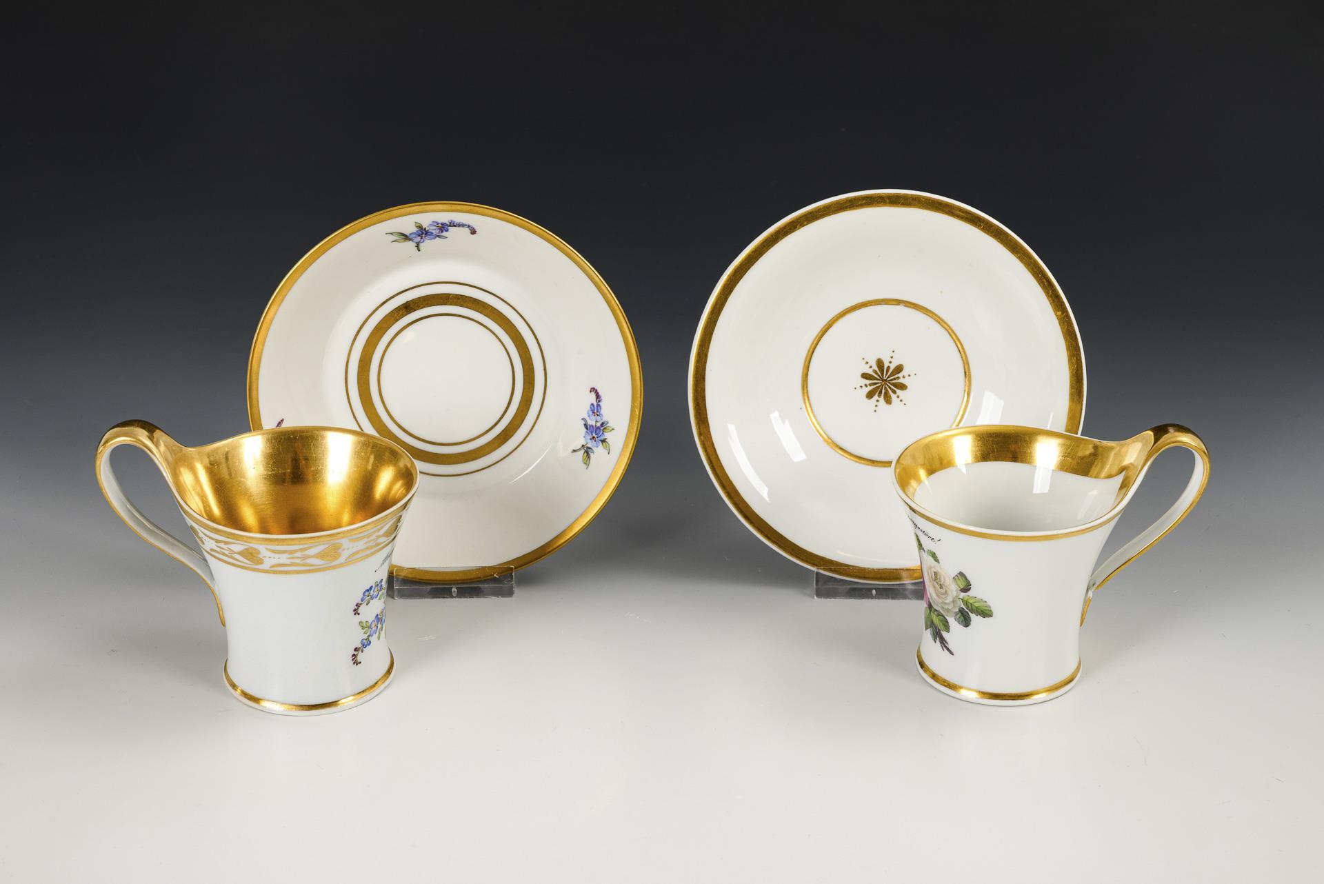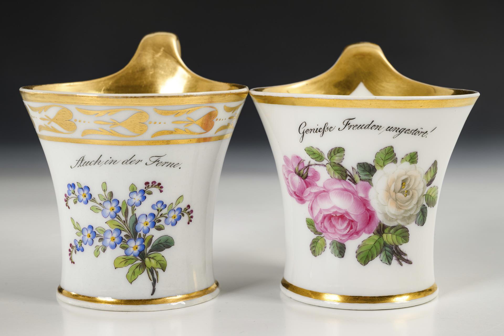 Model "Conical" with campanile handle. 1x sceptre mark, around 1800: with the depiction of a bouquet of forget-me-nots and the inscription "Auch in der Ferne", gilded inside / 1x sceptre mark and red-brown eagle mark, 1823-1832: with the depiction of a bouquet of roses and the inscription "Genieße Freuden ungestört!" . 1 handle with chip and hairline crack.
