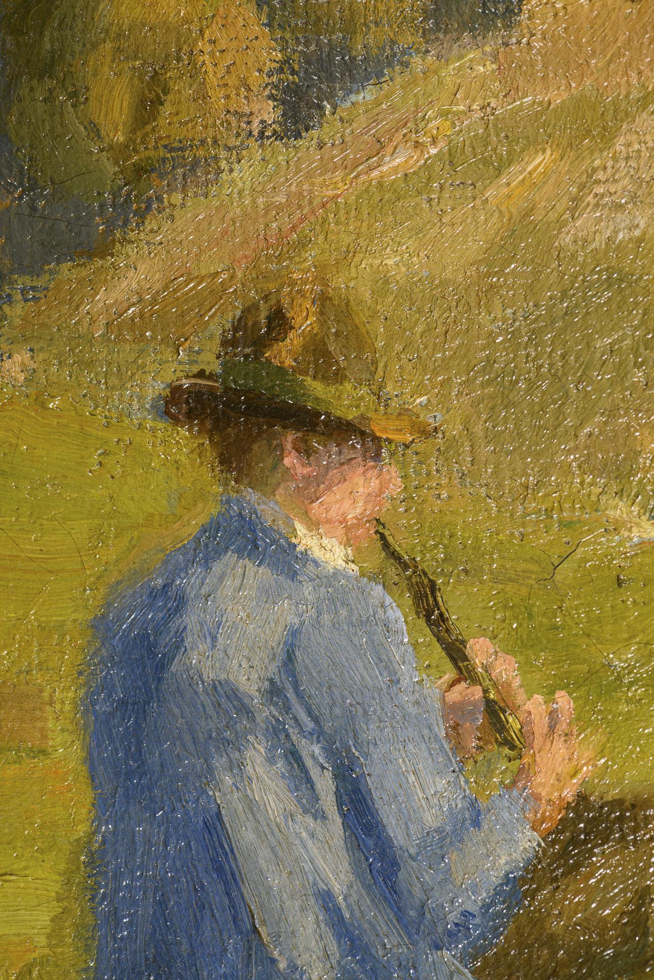 Sunny mountain landscape with staffage figure on a meadow with a view over the landscape.