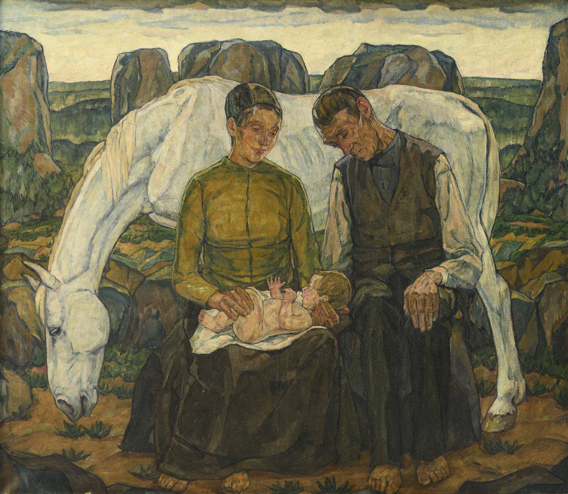 Peasant couple with baby and white horse resting in the mountains. One small restored area with backing.