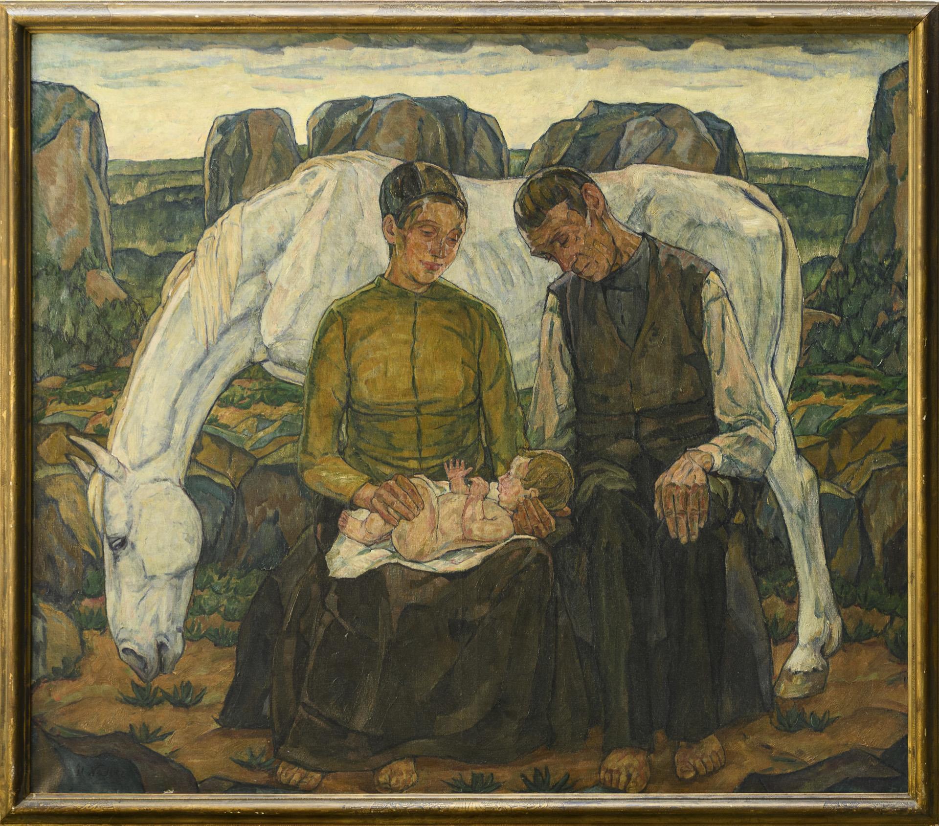 Peasant couple with baby and white horse resting in the mountains. One small restored area with backing.