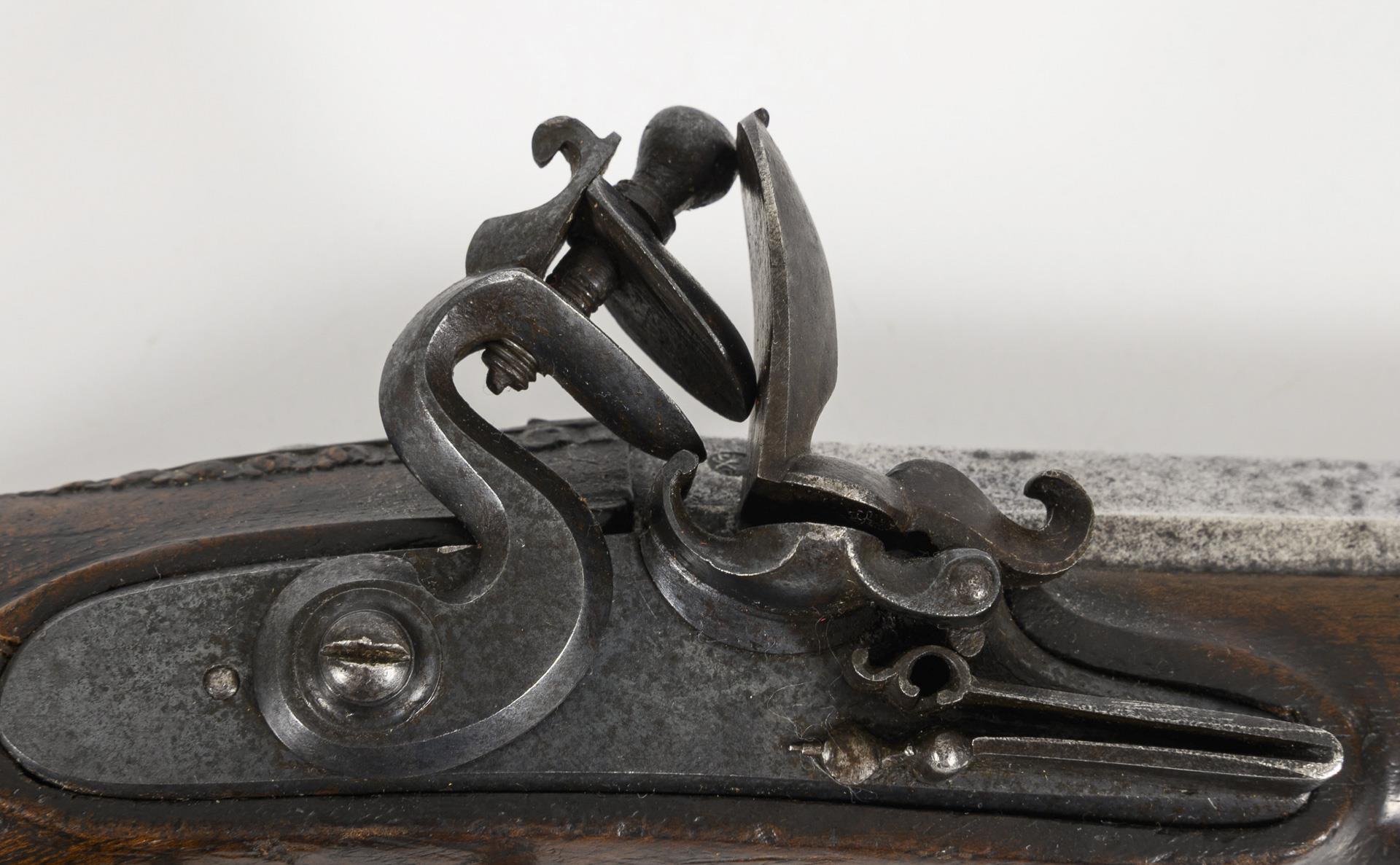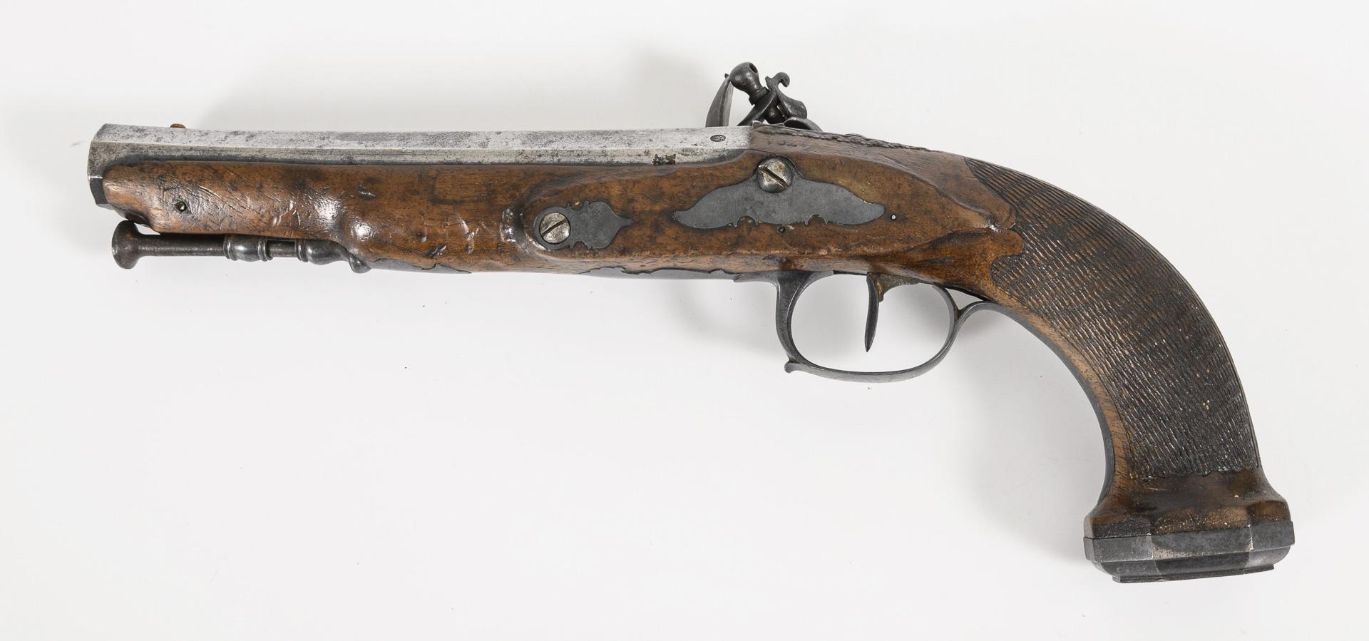 Octagonal barrel with large caliber (18 mm) and hairpin rifling, brass front sight and iron ramrod. On the barrel next to the master's mark another hallmark with an embossed "M". Lock with functioning mechanism. Octagonal, flat pommel with metal plate.