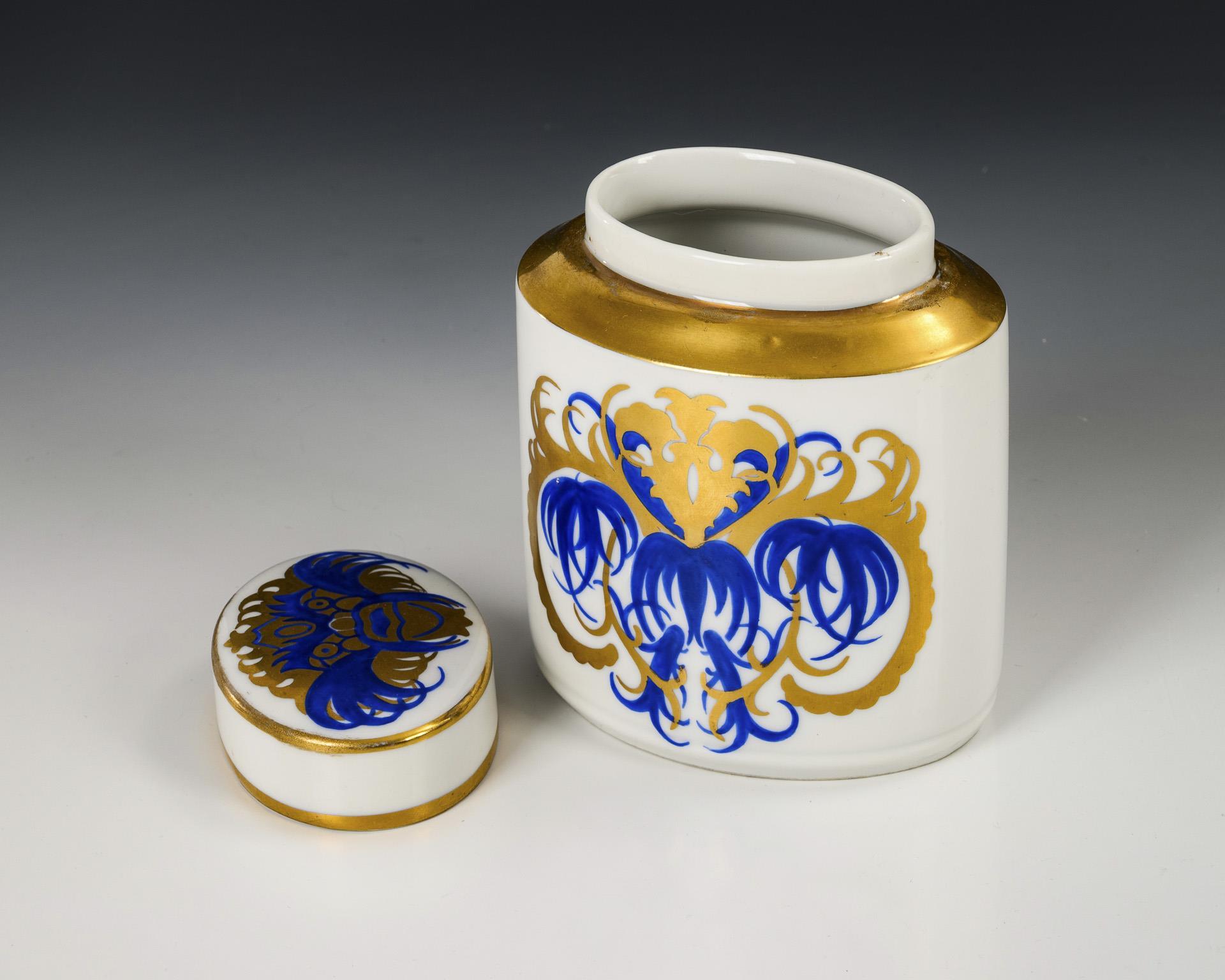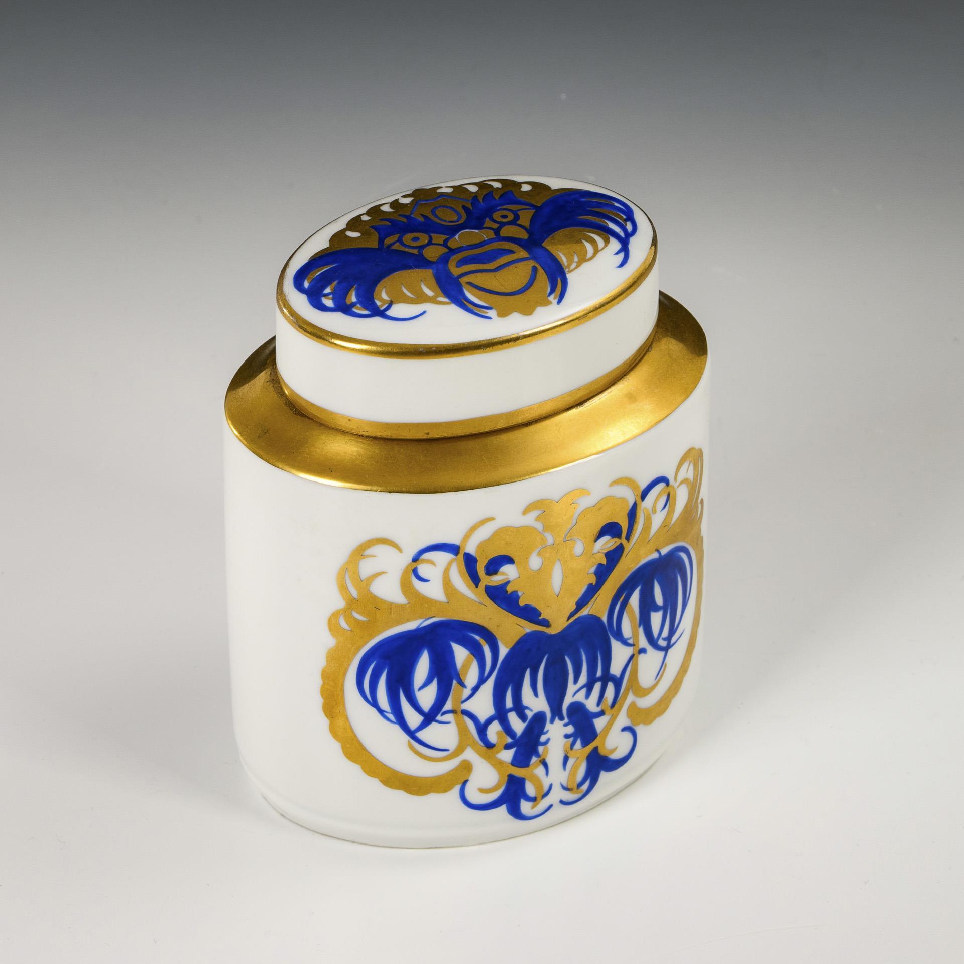 Oval cylinder box with abstract decoration painted in gold and blue.