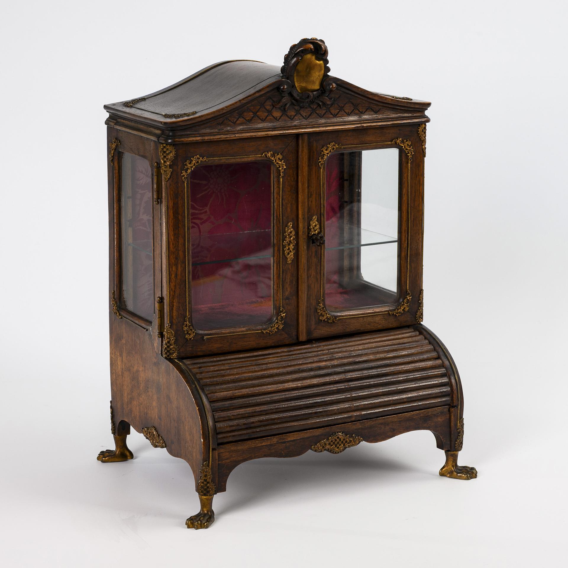 "Writing desk" on paw feet with a roller drawer that opens when the drawer on the front frame is pulled forward. Attachment glazed on 3 sides, with hinged doors and empty brass cartouche in the crown. Drawer and top lined on the inside with red velvet and silk; central clock holder in the drawer. Minor defects to the brass inlays.
