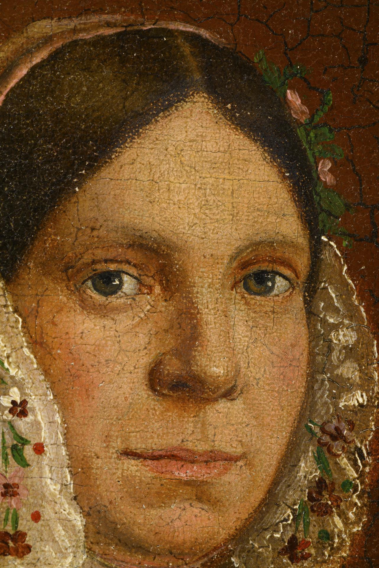 Portrait of a young woman in a black dress with flowered hood and a man in a green uniform. Traces of age.