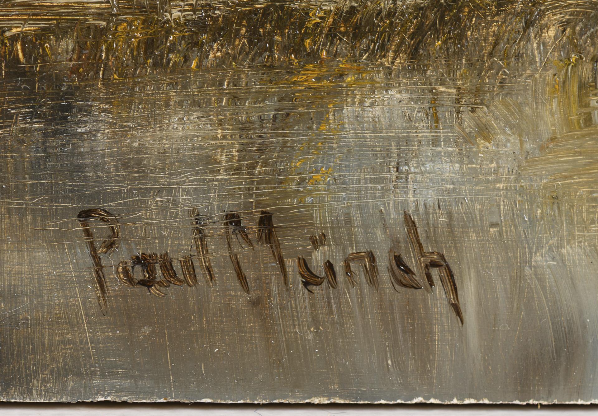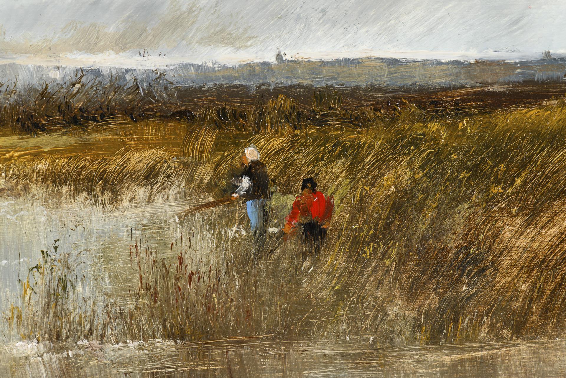 Wide Alpine foothills landscape with staffage figures on the reeds under a slightly cloudy sky.