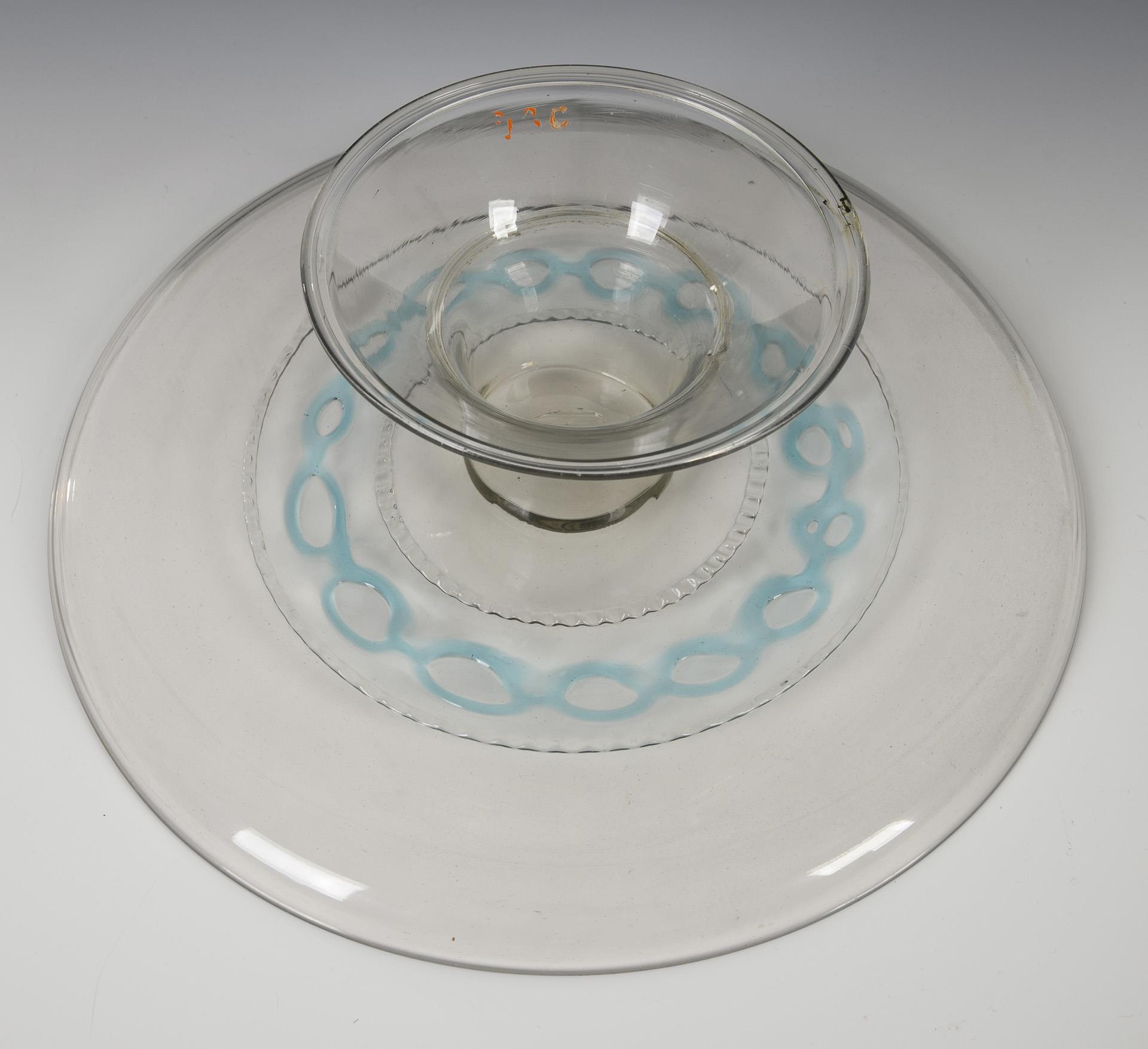 Façon de Venise. Large centerpiece: flat plate with a blue ring band between two wobbly ribbons, trumpet foot; with turned down rim and applied thread; tear-off. Remains of an old inventory number.