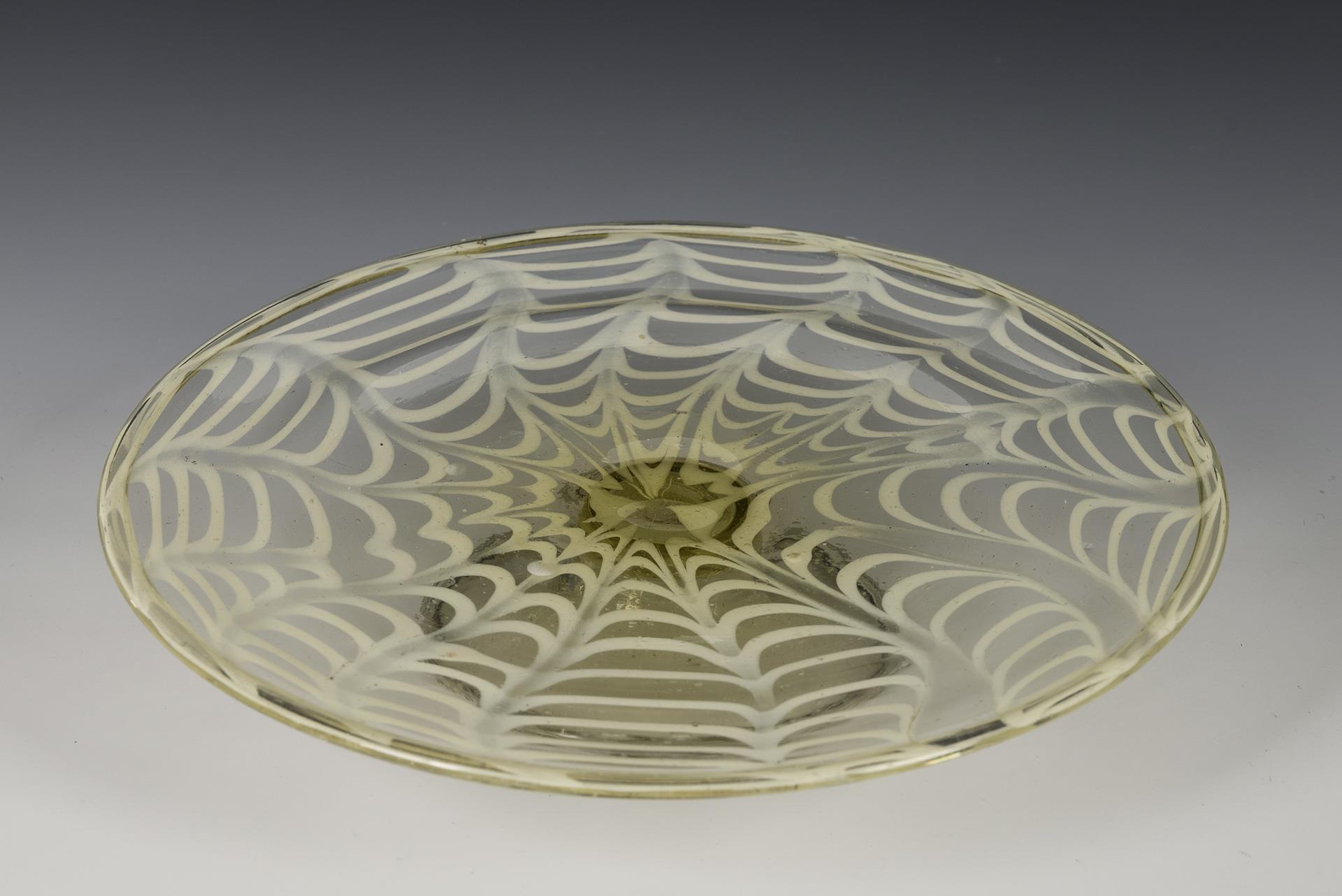 Colourless, greenish glass with melted, combed opal glass threads. H 3.5 cm, Ø 20 cm.