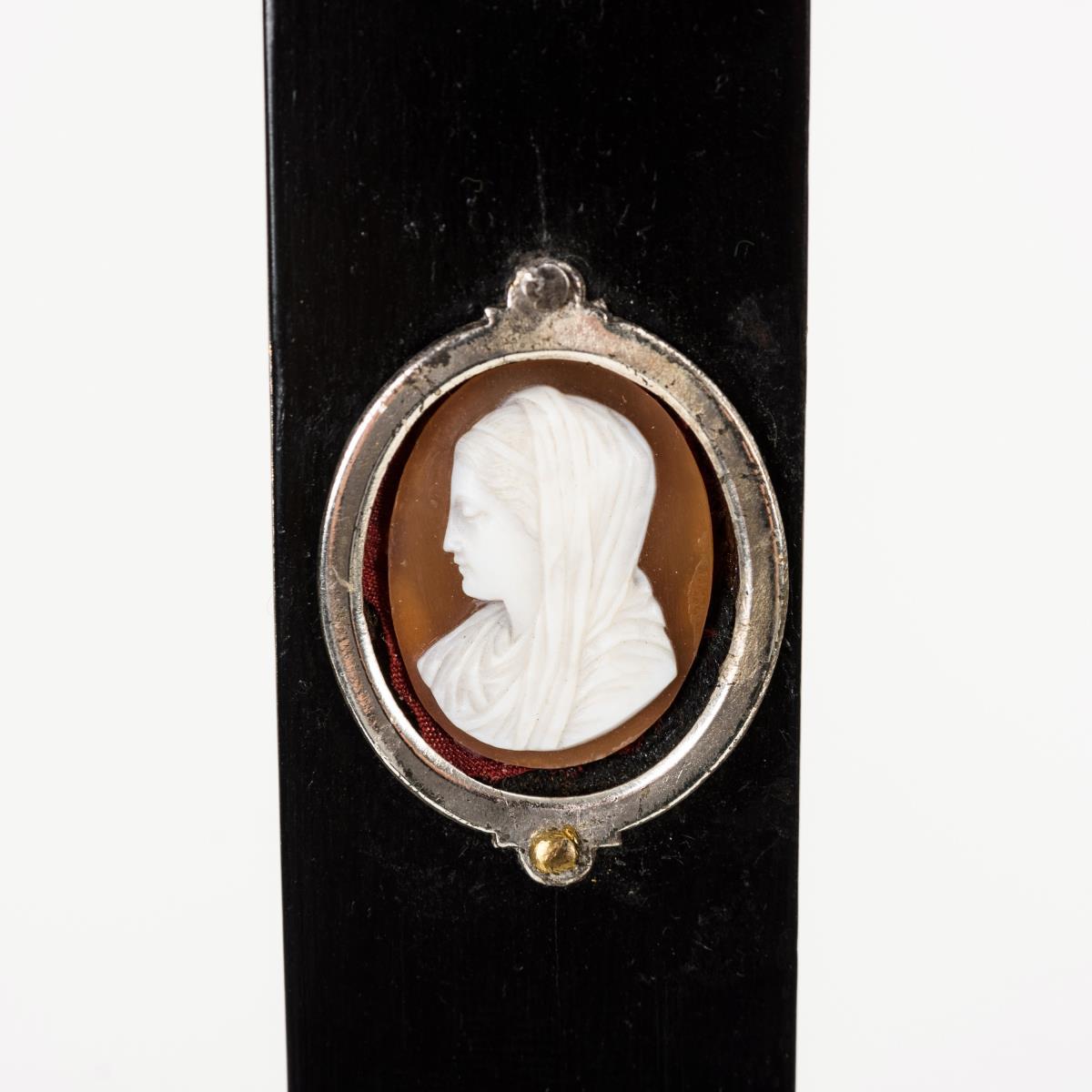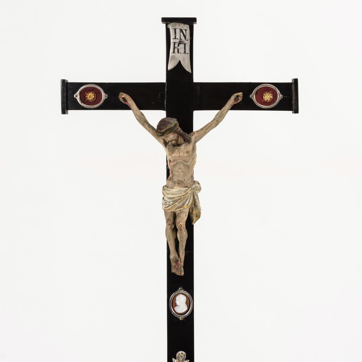Ebenholz(?) furniert, Holz geschnitzt und gefasst, silberfarbene Montierungen, Wachs, verschiedene Materialien.